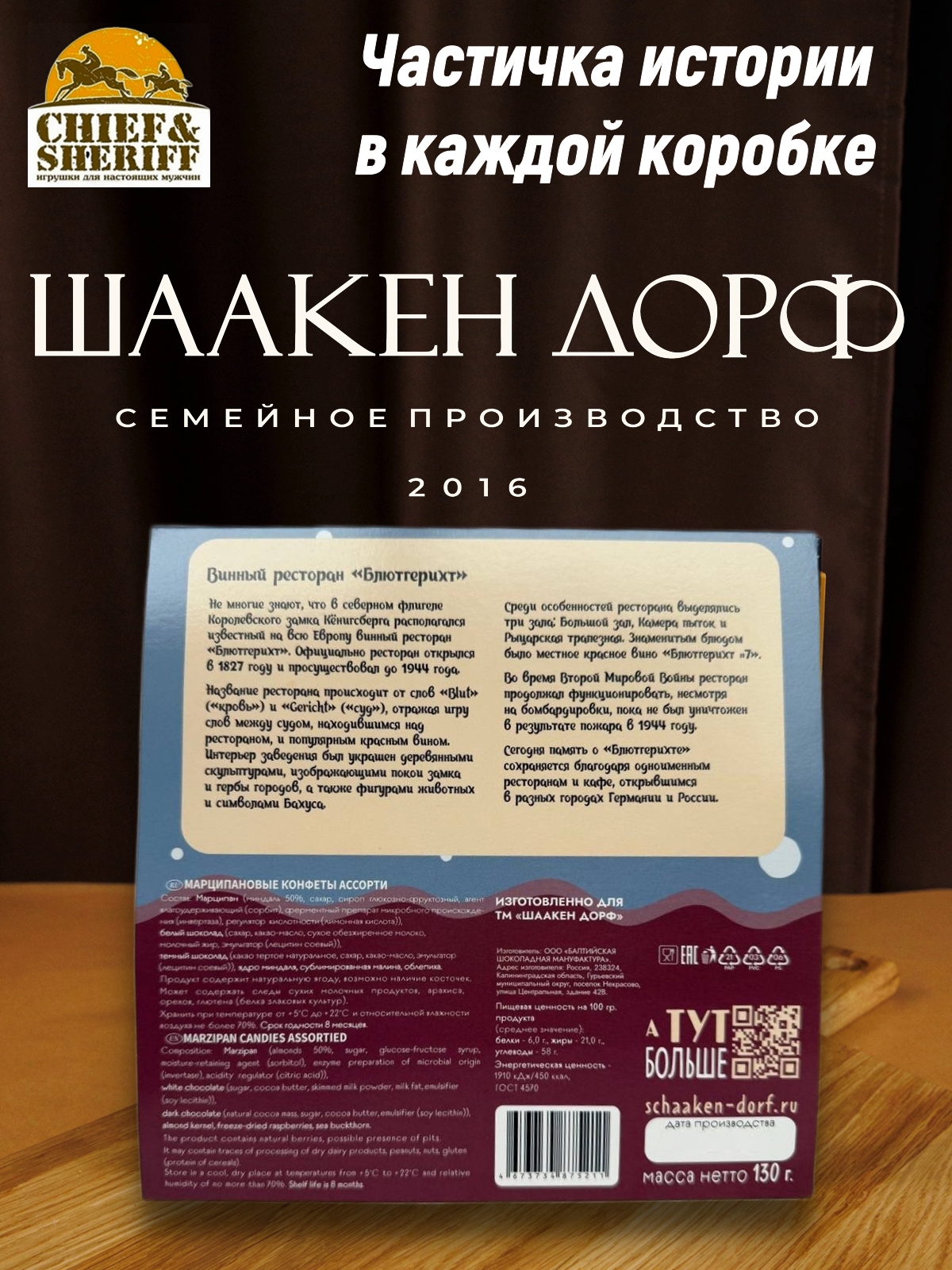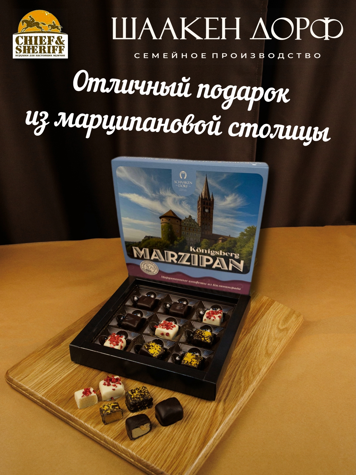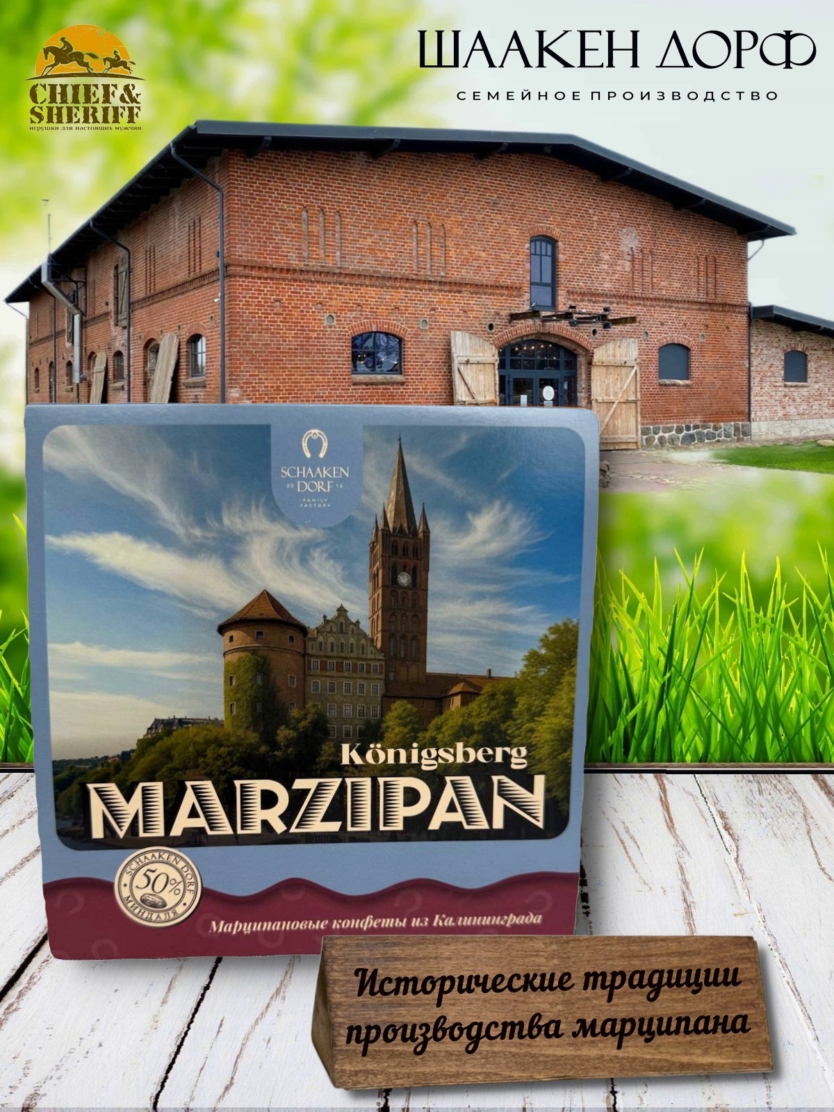 Шаакен Дорф - семейное производство сыра, марципана, шоколада, конфет и зефира. Производство компании Шаакен Дорф находится в Калининграде, в здании, которое когда-то было конюшней при замке Шаакен - рыцарей тевтонского ордена. Сейчас на первом этаже находится производство сыра. На втором этаже располагается небольшое кондитерское производство. Здесь вручную варится зефир, делаются карамелизированные апельсины в темном шоколаде, а также создается абсолютно разный и такой всеми полюбившийся калининградский марципан. В 2024 году, компания Шаакен Дорф стала победителем в номинациях «Лучшее туристическое направление года в номинации агротуризм», «Лучшее крестьянско-фермерское хозяйство», и многих других!