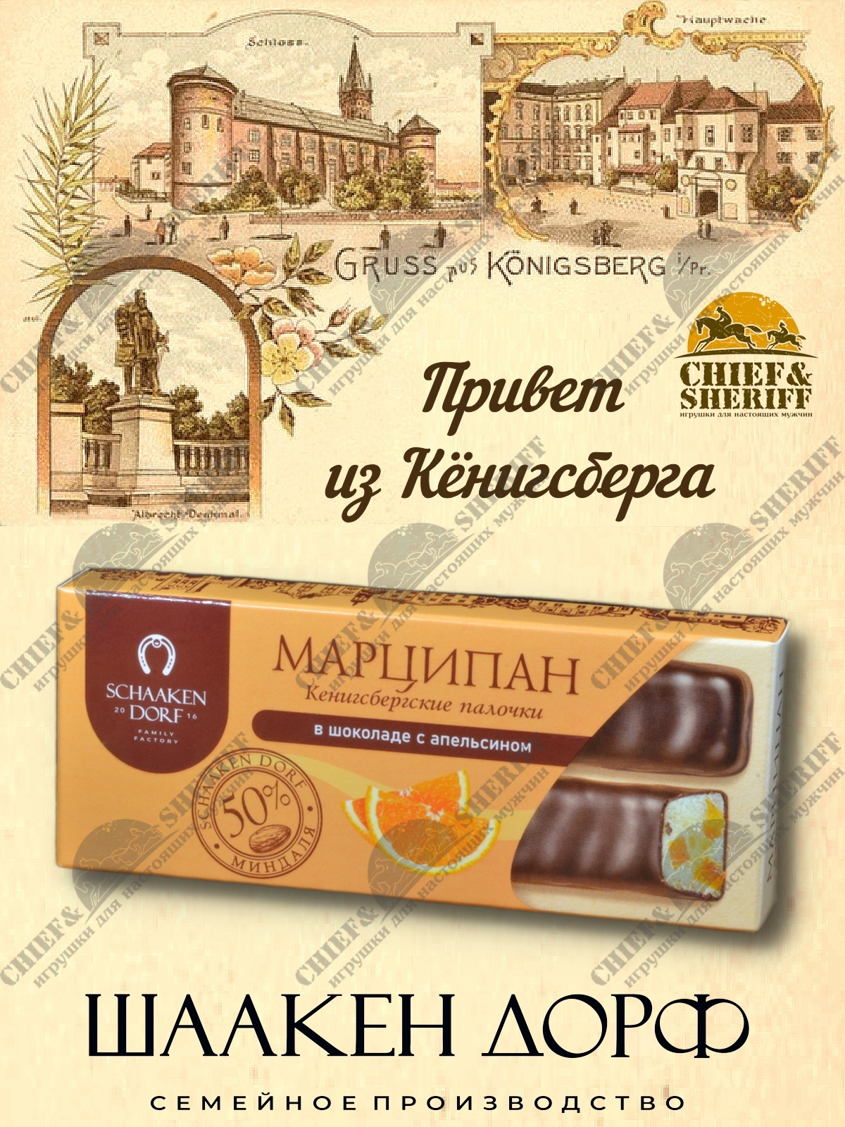 Кёнигсбергские палочки - это настоящий высококачественный марципан с содержанием миндаля 50%. Они с любовью изготовлены на семейном предприятии Шаакен Дорф, расположенном в Калининградской области, в здании, которое когда-то было конюшней при замке Шаакен. Сейчас здесь находится производство сыра, марципана, шоколада, конфет и зефира. В 2024 году, компания Шаакен Дорф стала победителем в номинациях «Лучшее туристическое направление года в номинации агротуризм», «Лучшее крестьянско-фермерское хозяйство»,  и многих других!
