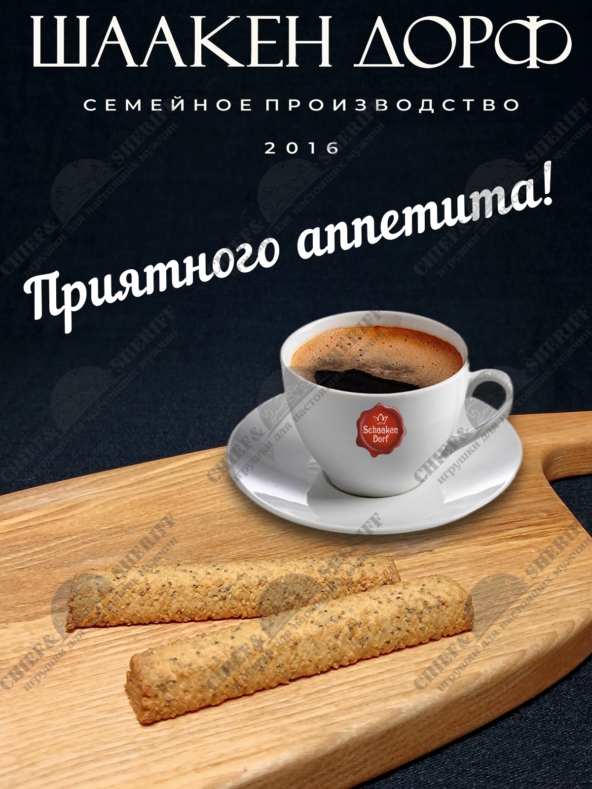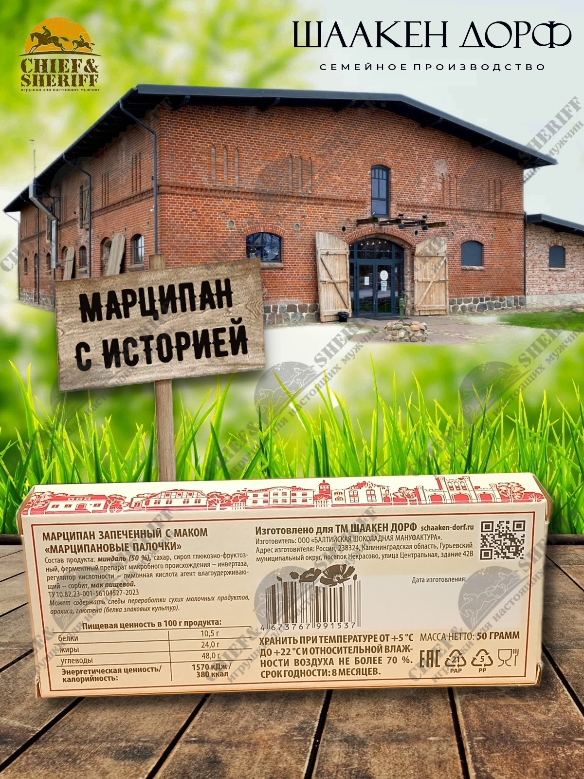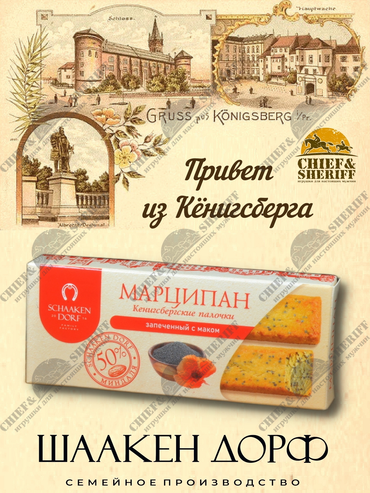 Кёнигсбергские палочки - это настоящий высококачественный марципан с содержанием миндаля 50%. Они с любовью изготовлены на семейном предприятии Шаакен Дорф, расположенном в Калининградской области, в здании, которое когда-то было конюшней при замке Шаакен. Сейчас здесь находится производство сыра, марципана, шоколада, конфет и зефира. В 2024 году, компания Шаакен Дорф стала победителем в номинациях «Лучшее туристическое направление года в номинации агротуризм», «Лучшее крестьянско-фермерское хозяйство»,  и многих других!