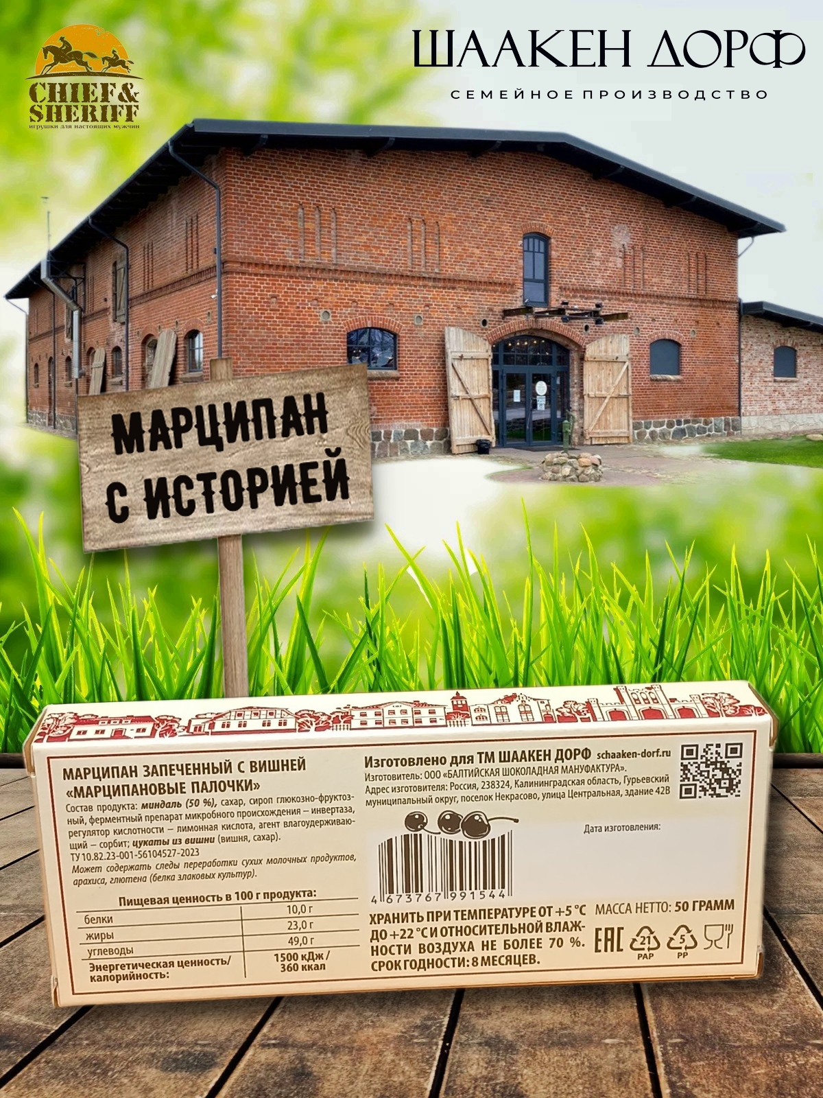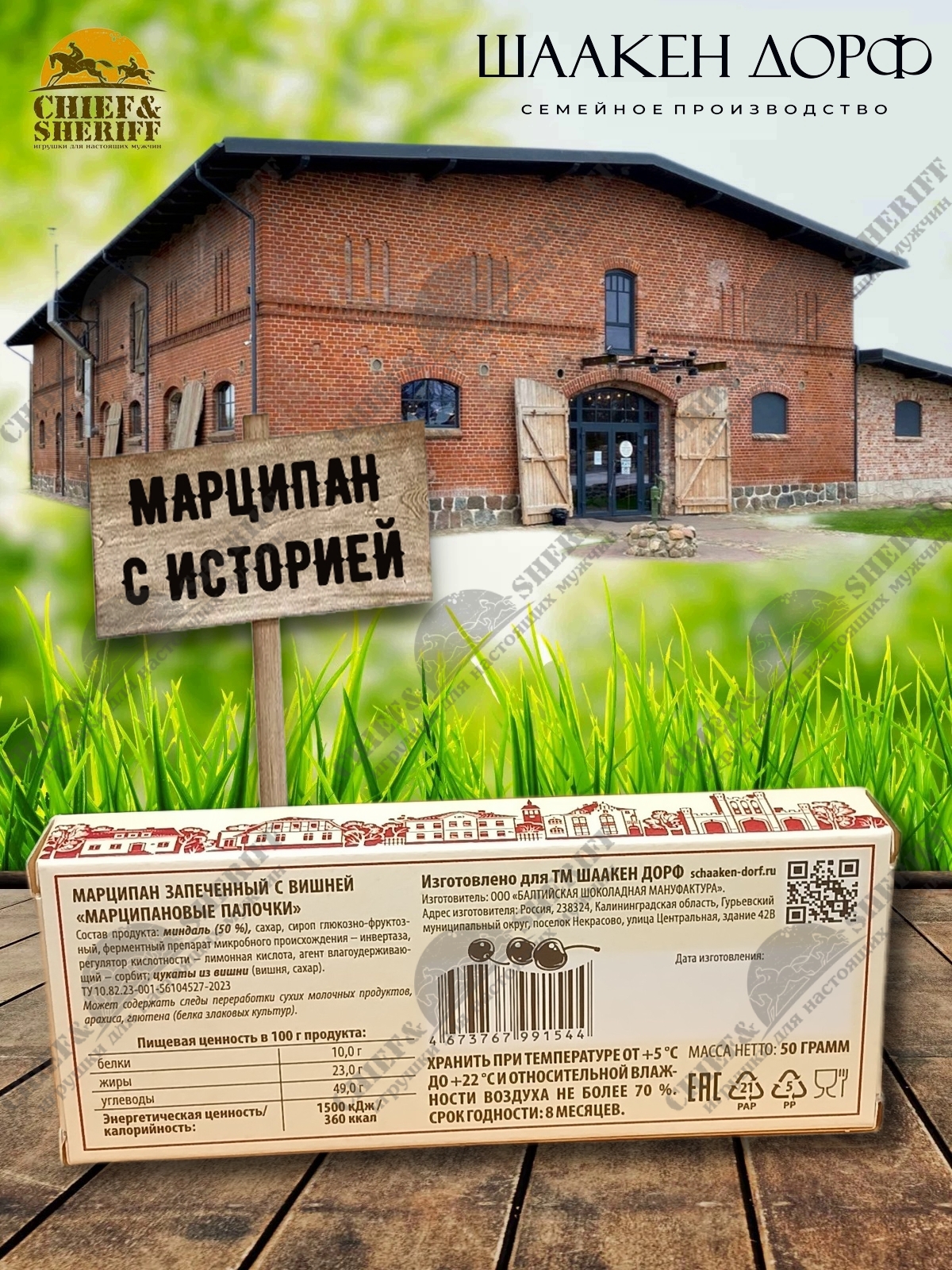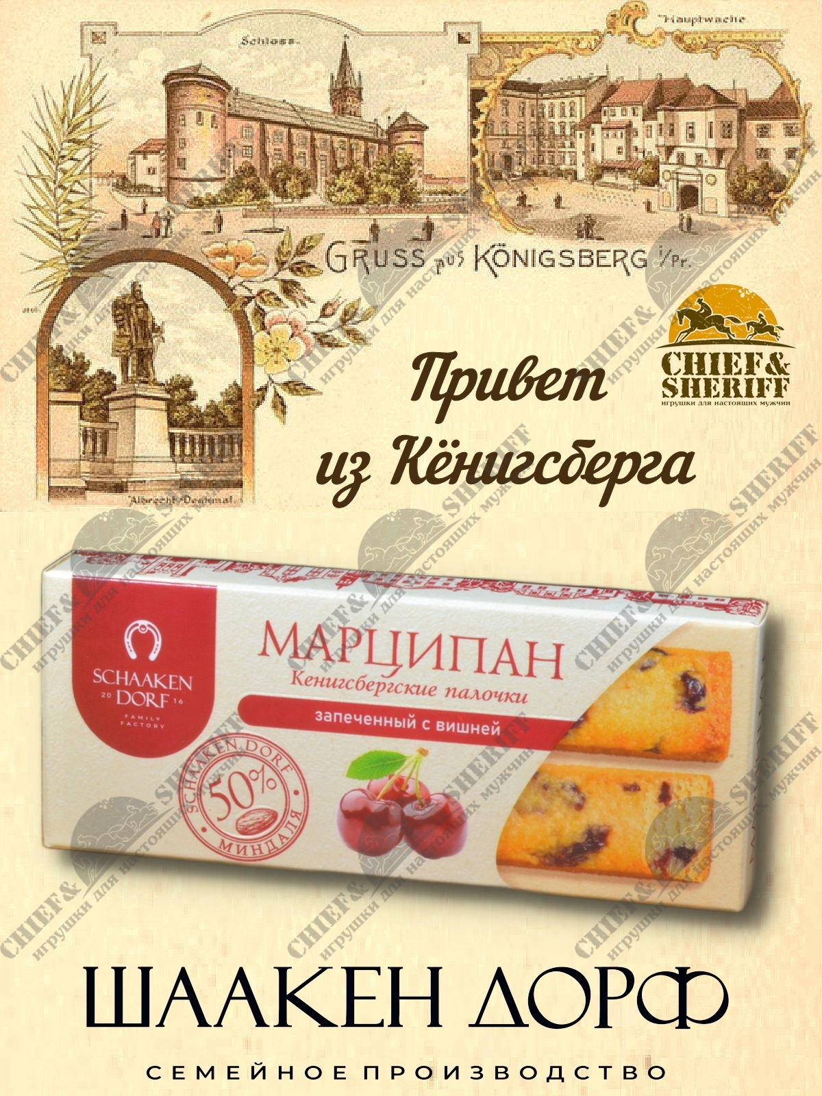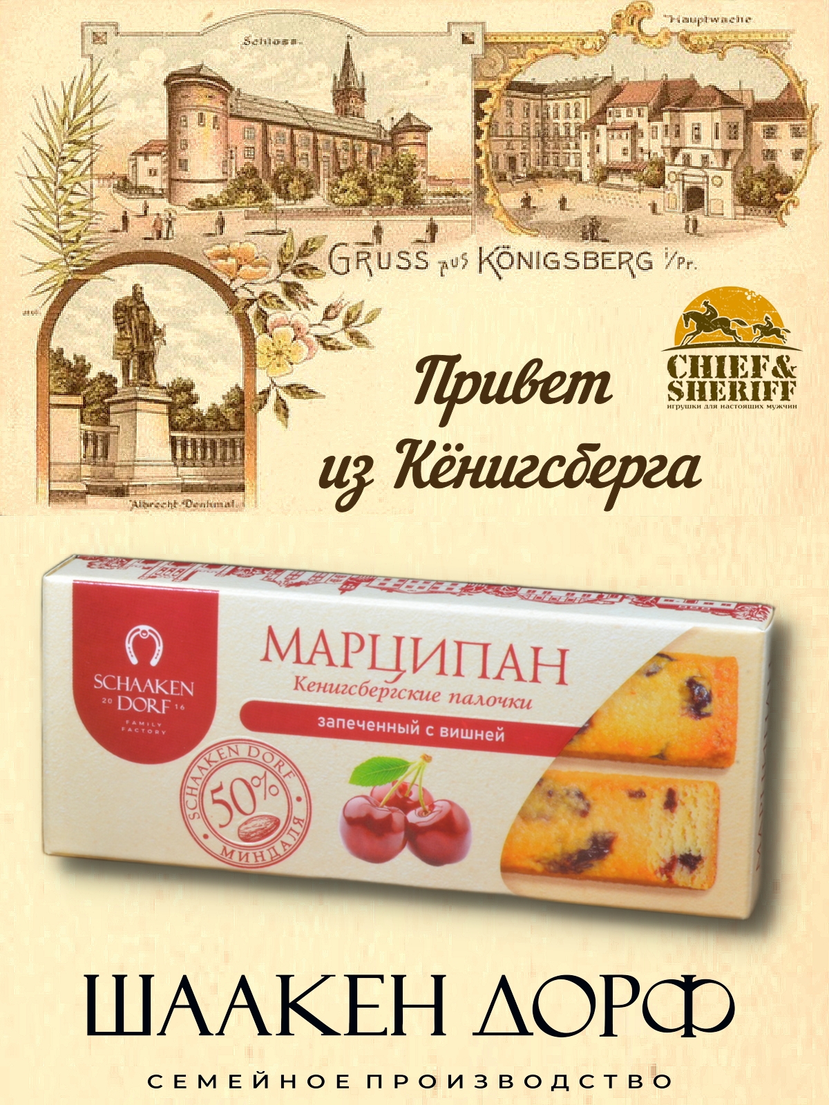 Кёнигсбергские палочки - это настоящий высококачественный марципан с содержанием миндаля 50%. Они с любовью изготовлены на семейном предприятии Шаакен Дорф, расположенном в Калининградской области, в здании, которое когда-то было конюшней при замке Шаакен. Сейчас здесь находится производство сыра, марципана, шоколада, конфет и зефира. В 2024 году, компания Шаакен Дорф стала победителем в номинациях «Лучшее туристическое направление года в номинации агротуризм», «Лучшее крестьянско-фермерское хозяйство»,  и многих других!
