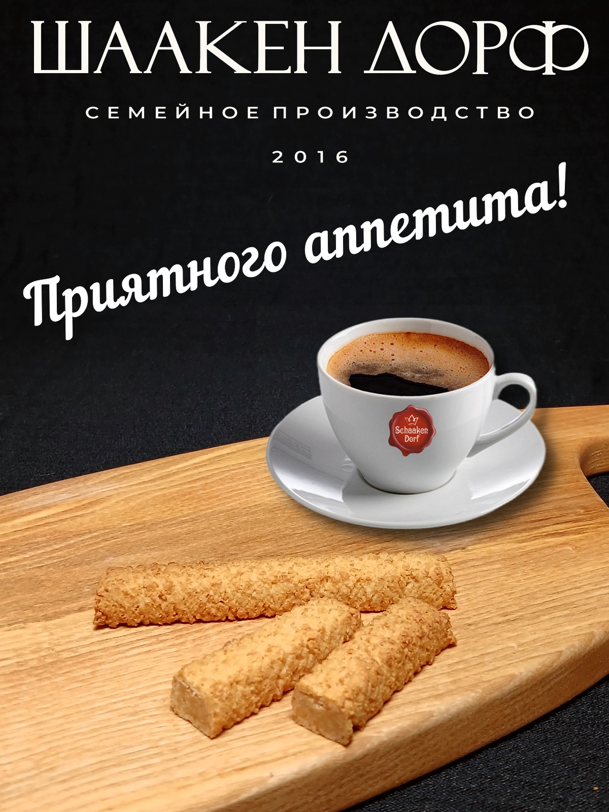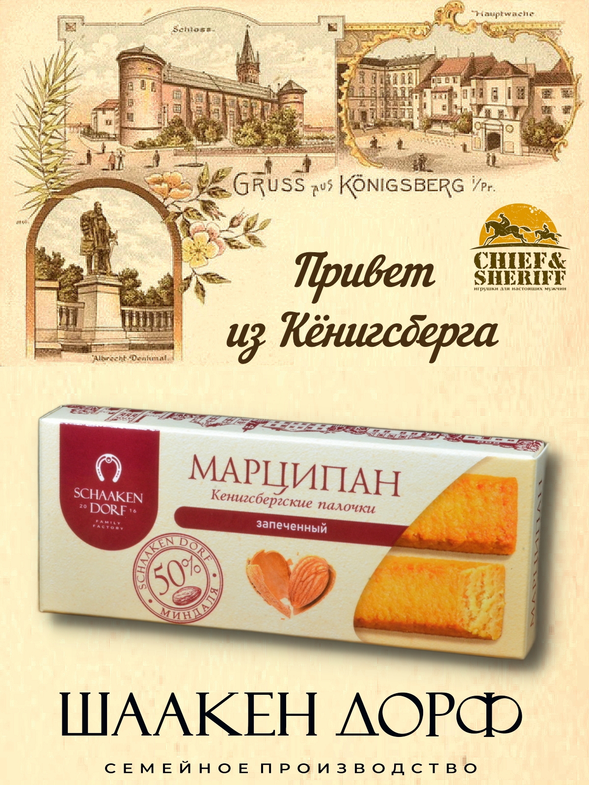 Кёнигсбергские палочки - это настоящий высококачественный марципан с содержанием миндаля 50%. Они с любовью изготовлены на семейном предприятии Шаакен Дорф, расположенном в Калининградской области, в здании, которое когда-то было конюшней при замке Шаакен. Сейчас здесь находится производство сыра, марципана, шоколада, конфет и зефира. В 2024 году, компания Шаакен Дорф стала победителем в номинациях «Лучшее туристическое направление года в номинации агротуризм», «Лучшее крестьянско-фермерское хозяйство»,  и многих других!