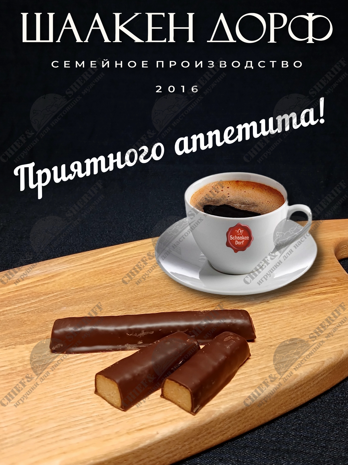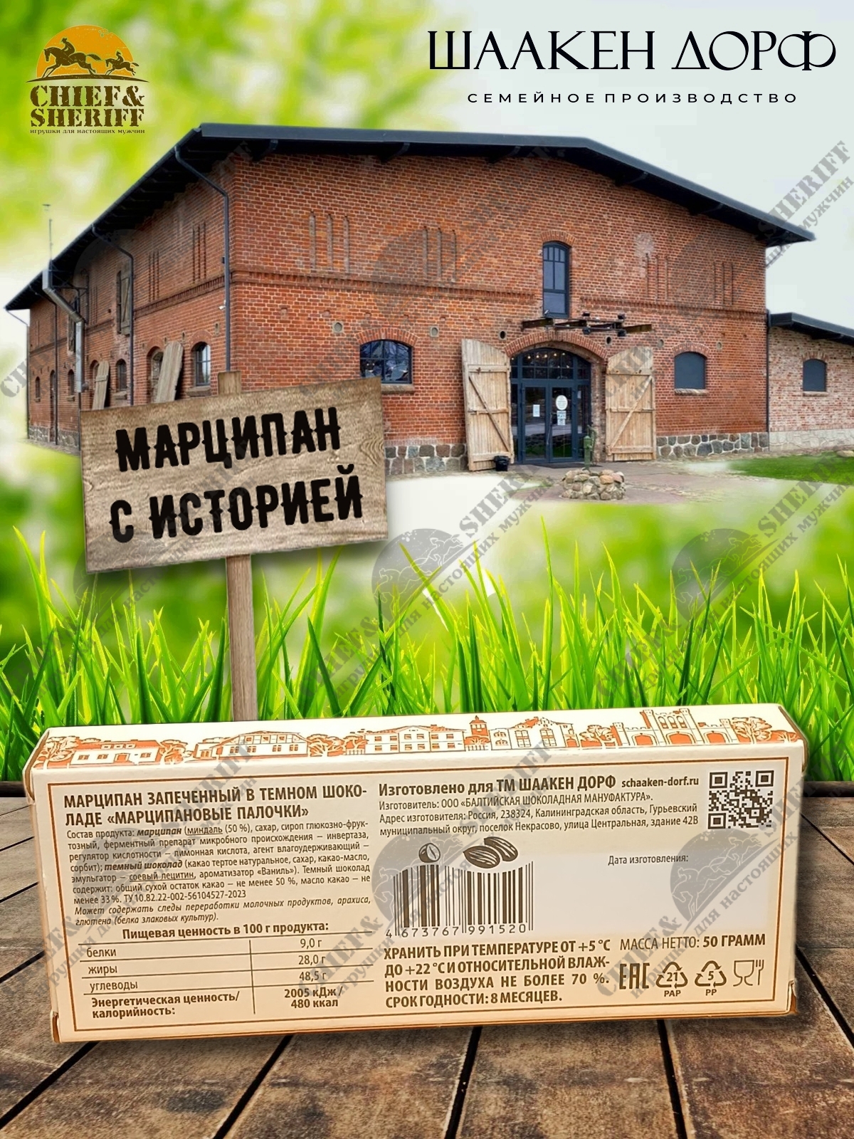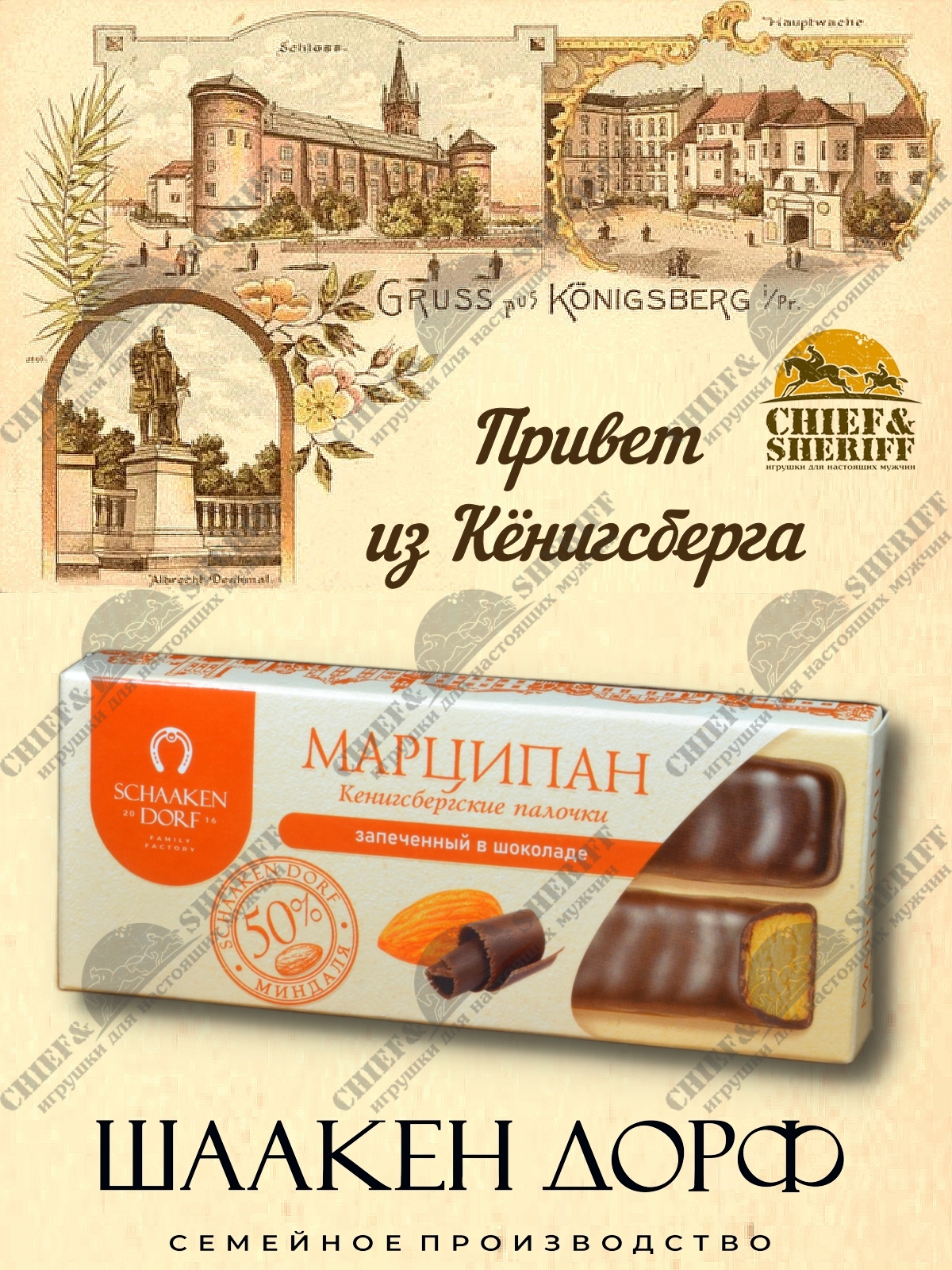 Кёнигсбергские палочки - это настоящий высококачественный марципан с содержанием миндаля 50%. Они с любовью изготовлены на семейном предприятии Шаакен Дорф, расположенном в Калининградской области, в здании, которое когда-то было конюшней при замке Шаакен. Сейчас здесь находится производство сыра, марципана, шоколада, конфет и зефира. В 2024 году, компания Шаакен Дорф стала победителем в номинациях «Лучшее туристическое направление года в номинации агротуризм», «Лучшее крестьянско-фермерское хозяйство»,  и многих других!