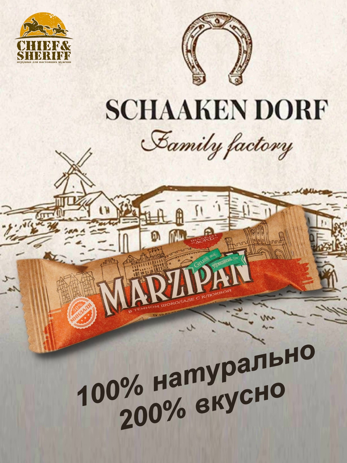 Шаакен Дорф - семейное производство сыра, марципана, шоколада, конфет и зефира, расположенное в Калининграде. Предприятие является обладателем многочисленных наград не только в области переработки молока и изготовлении кондитерских изделий, но и в агротуризме. Марципан от Schaaken Dorf как минимум не уступает по качеству немецкому марципану от лучших производителей марципана из Германии. Попробуйте - и убедитесь сами!