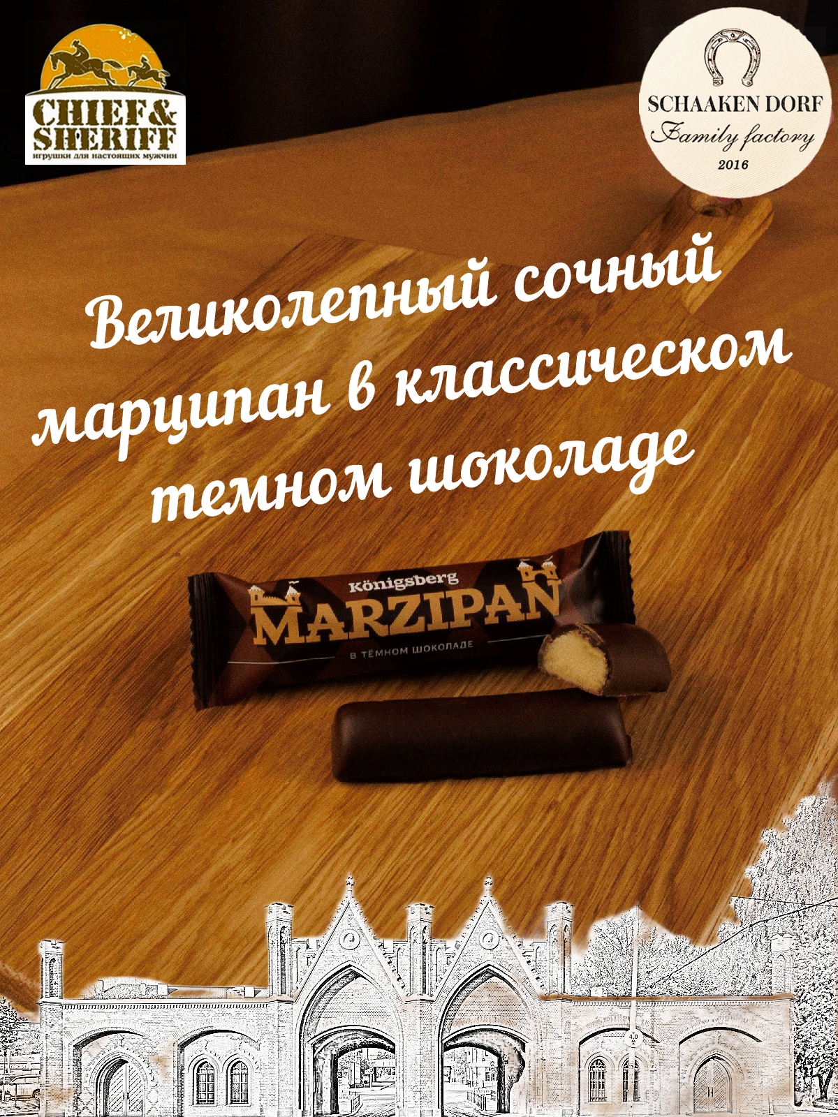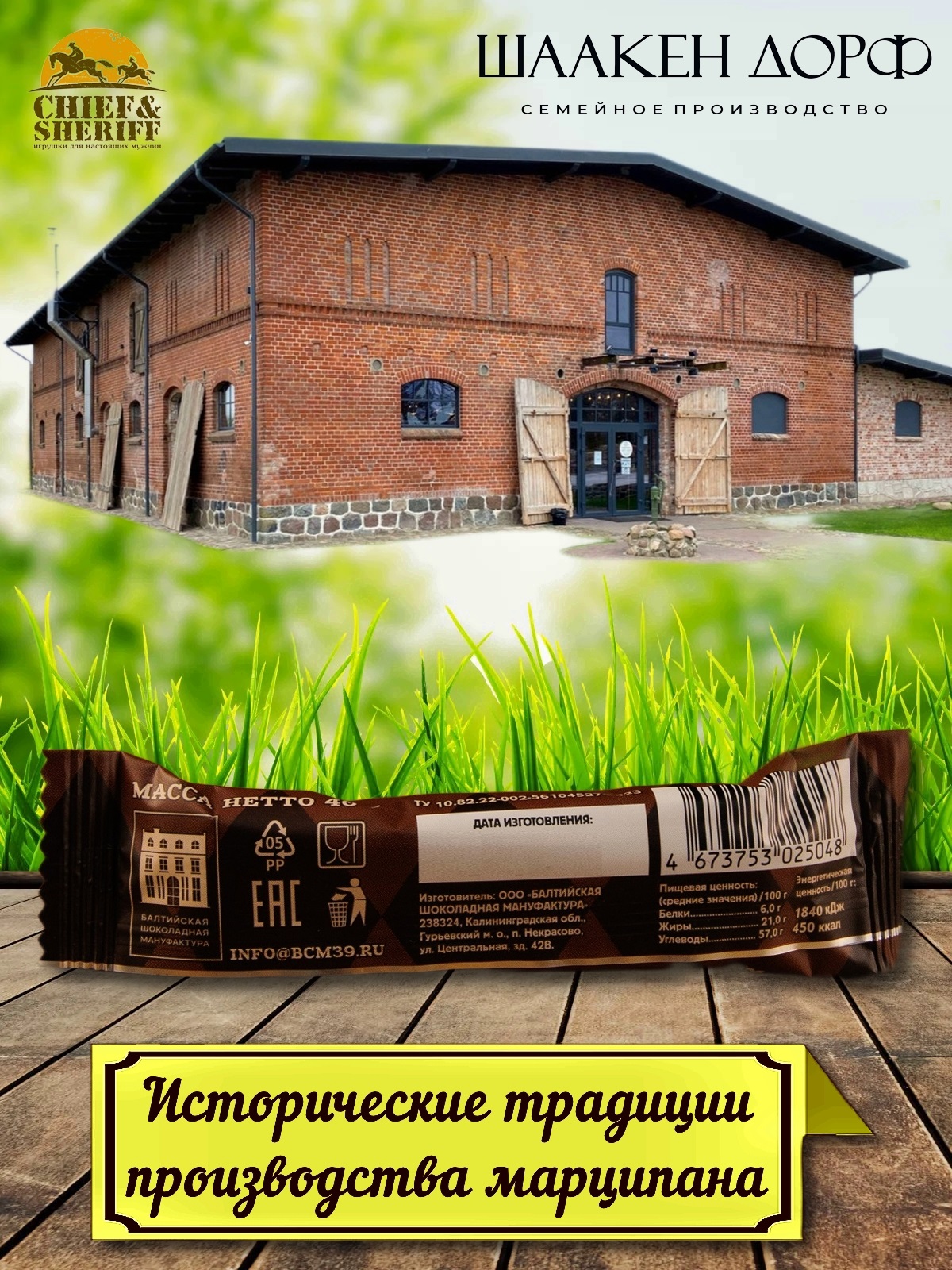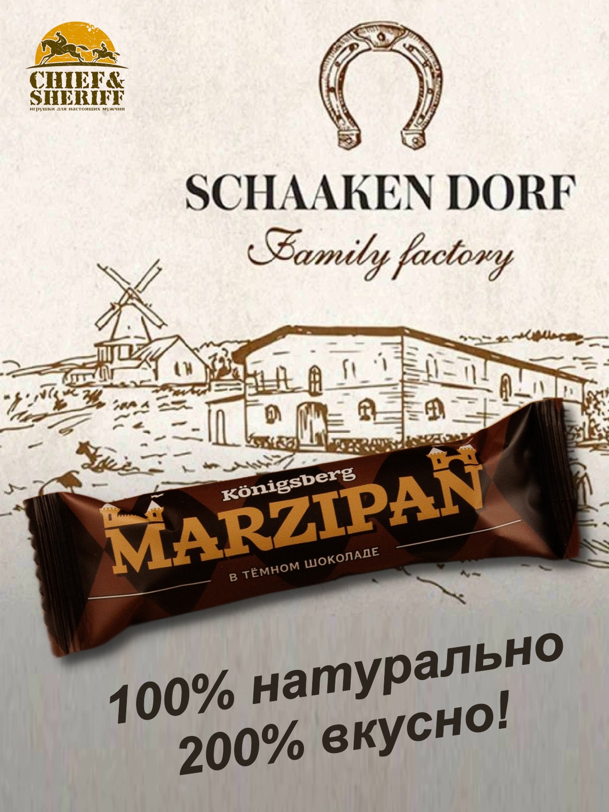 Шаакен Дорф - семейное производство сыра, марципана, шоколада, конфет и зефира. Производство компании Шаакен Дорф находится в Калининграде, в здании, которое когда-то было конюшней при замке Шаакен - рыцарей еще тевтонского ордена. Сейчас на первом этаже находится производство сыра. На втором этаже располагается небольшое кондитерское производство. Здесь вручную варится зефир, делаются карамелизированные апельсины в темном шоколаде, сублимированные ягоды, а также создается абсолютно разный и такой всеми полюбившийся калининградский марципан. В 2024 году, компания Шаакен Дорф стала победителем в номинациях «Лучшее туристическое направление года в номинации агротуризм», «Лучшее крестьянско-фермерское хозяйство», «Лучшее хозяйство в отрасли переработки молока», «Лучший объект туристического показа» и многих других! Марципан от Schaaken Dorf как минимум не уступает по качеству немецкому марципану от лучших производителей марципана из Германии. Попробуйте - и убедитесь сами!