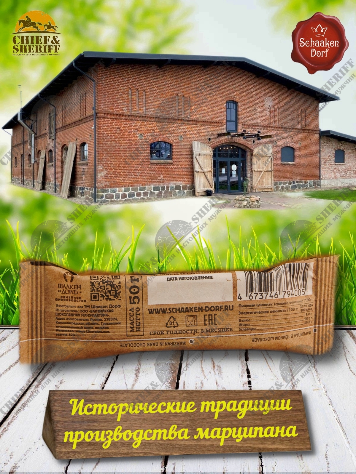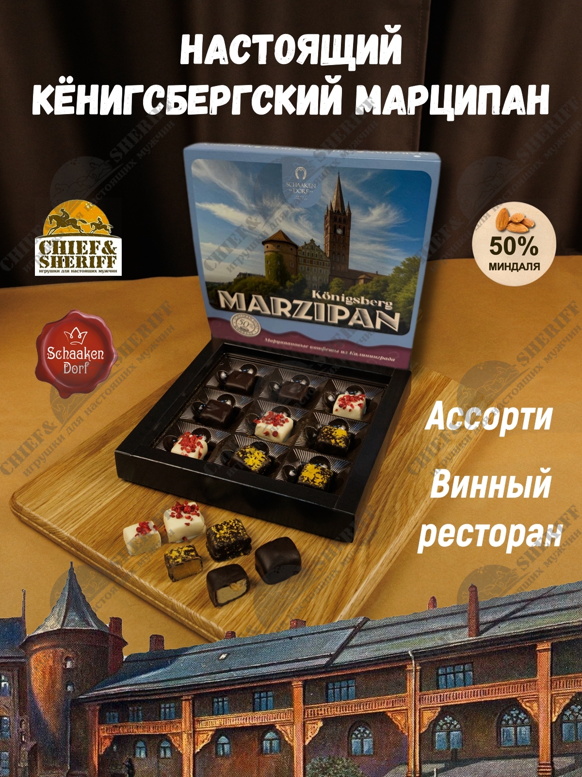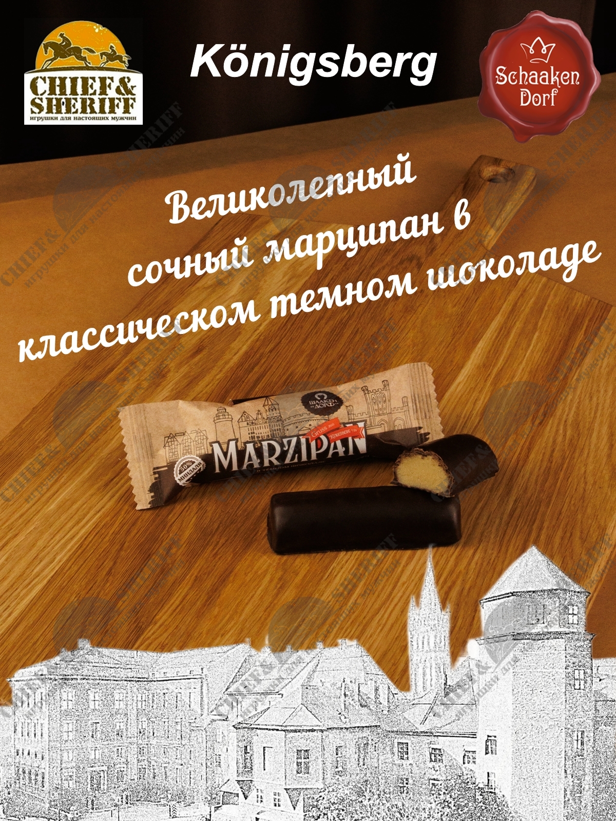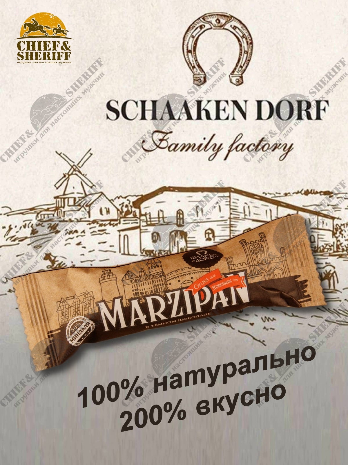 Шаакен Дорф - семейное производство сыра, марципана, шоколада, конфет и зефира, расположенное в Калининграде. Предприятие является обладателем многочисленных наград не только в области переработки молока и изготовлении кондитерских изделий, но и в агротуризме. Марципан от Schaaken Dorf как минимум не уступает по качеству немецкому марципану от лучших производителей марципана из Германии. Попробуйте - и убедитесь сами!