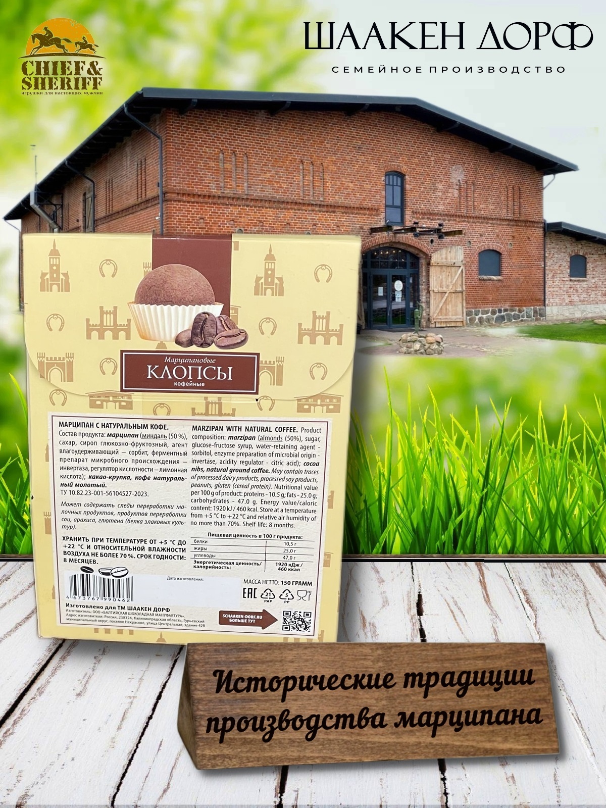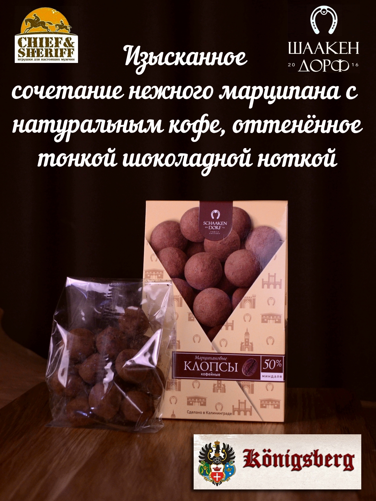 Откройте для себя удивительный вкус марципановых клопсов с натуральным кофе и какао-крупкой от SCHAAKEN DORF. Эти уникальные кондитерские изделия подарят вам настоящее наслаждение. Каждый сет содержит 2 красивых упаковки по 150 граммов изысканных конфет, в которых гармонично сочетаются нежный калининградский марципан, кофе и шоколад.