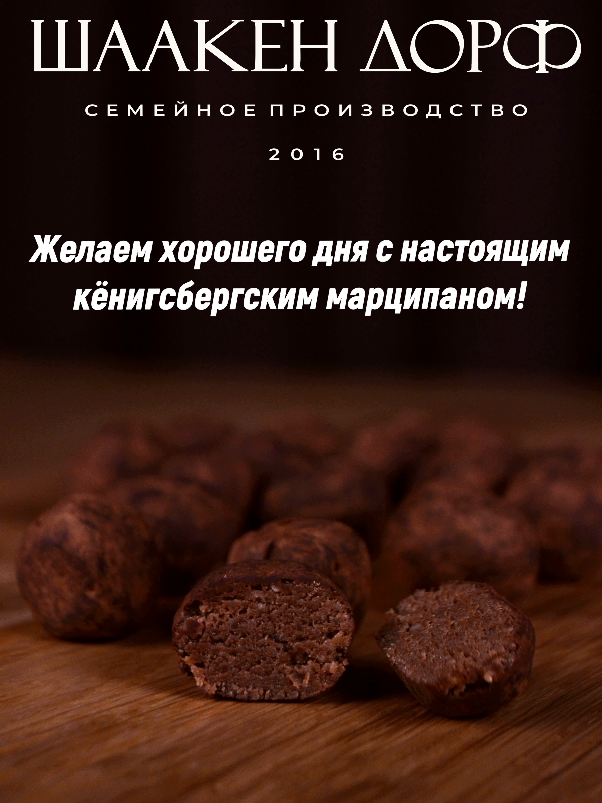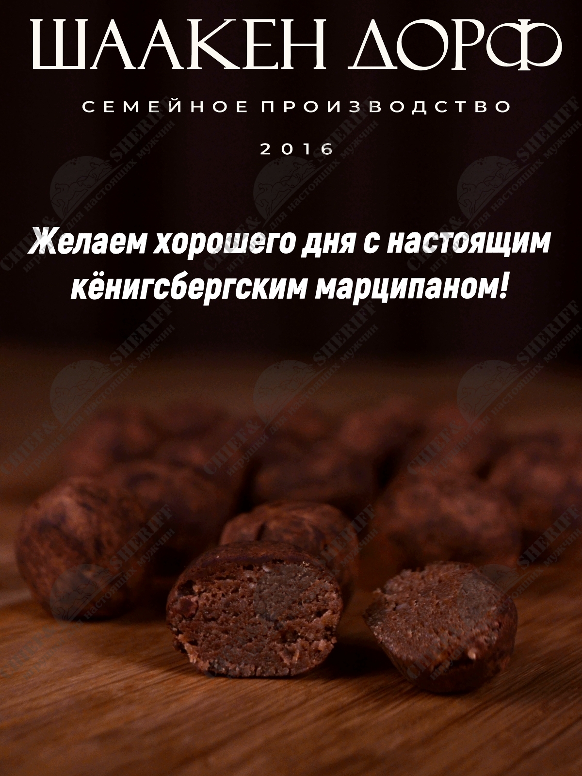 Шаакен Дорф - семейное производство сыра, марципана, шоколада, конфет и зефира. Производство компании Шаакен Дорф находится в Калининграде, в здании, которое когда-то было конюшней при замке Шаакен - рыцарей еще тевтонского ордена. Сейчас на первом этаже находится производство сыра. На втором этаже располагается небольшое кондитерское производство. Здесь вручную варится зефир, делаются карамелизированные апельсины в темном шоколаде, сублимированные ягоды, а также создается абсолютно разный и такой всеми полюбившийся калининградский марципан. В 2024 году, компания Шаакен Дорф стала победителем в номинациях «Лучшее туристическое направление года в номинации агротуризм», «Лучшее крестьянско-фермерское хозяйство», «Лучшее хозяйство в отрасли переработки молока», «Лучший объект туристического показа» и многих других! Марципан от Schaaken Dorf как минимум не уступает по качеству немецкому марципану от лучших производителей марципана из Германии. Попробуйте - и убедитесь сами!