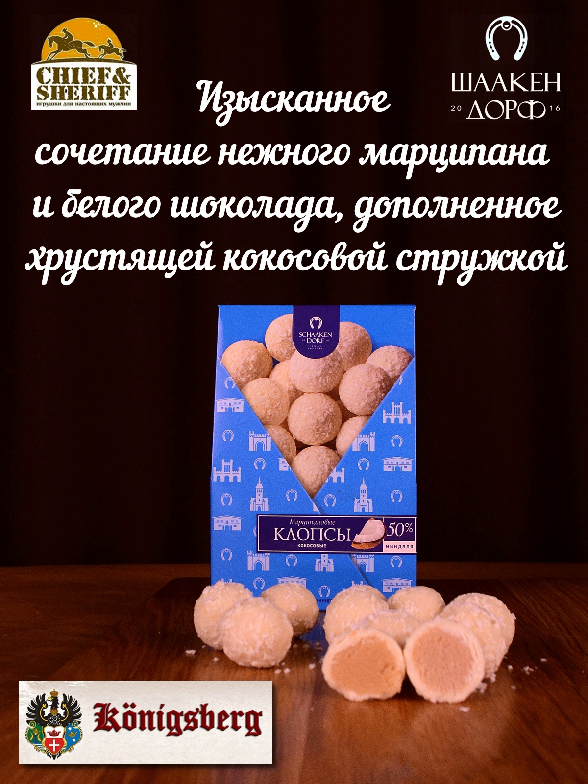 Произведенные в Калининграде, эти марципановые клопсы с кокосом станут идеальным дополнением к вашему десертному столу или отличным угощением к чаю. Нежный вкус марципана в сочетании с белым шоколадом, оттененный кокосом, создаёт незабываемый букет ароматов и текстур. В каждой конфете ощущается забота и внимание к качеству ингредиентов, что делает их не только вкусными, но и безопасными.