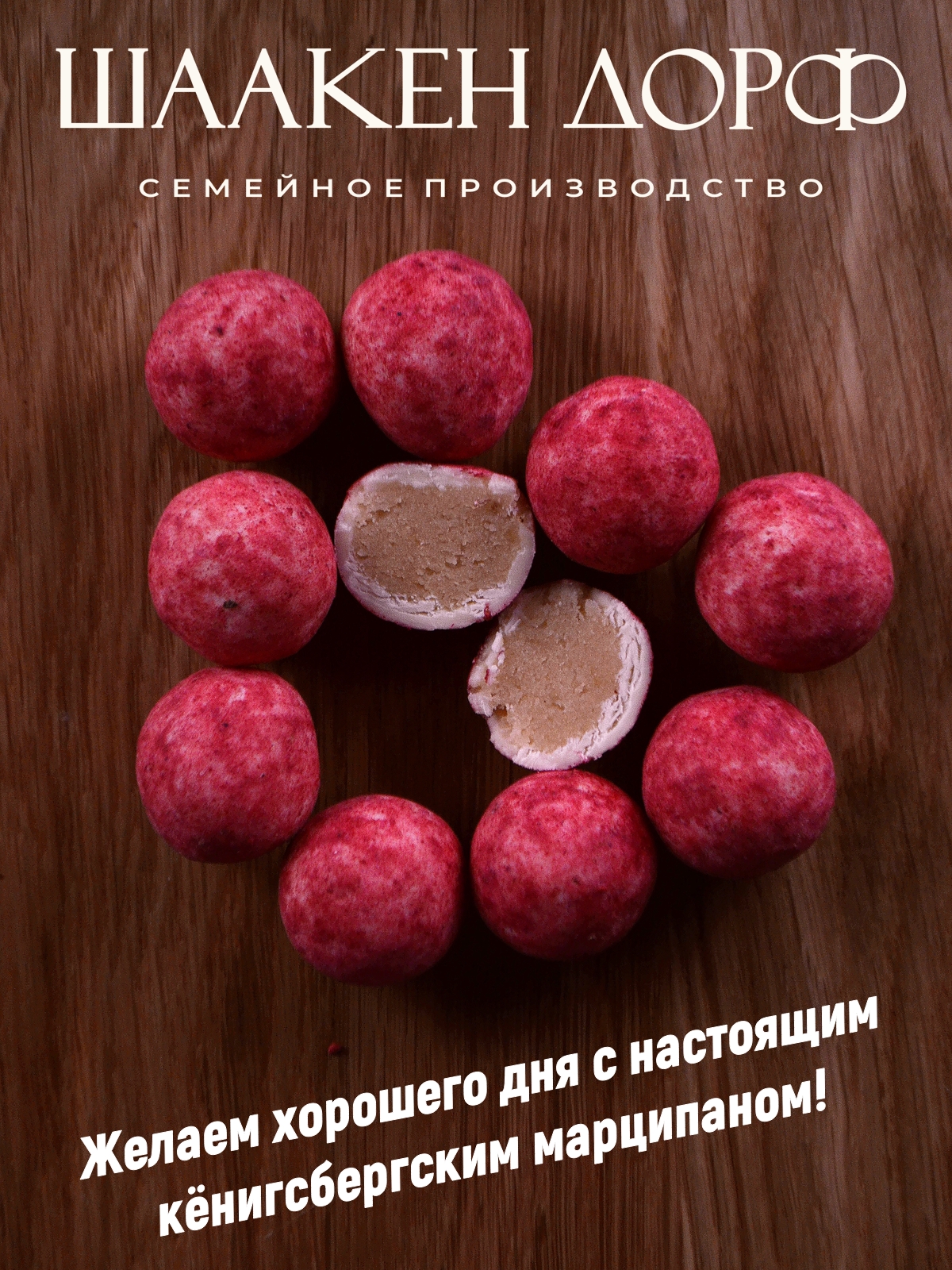 Шаакен Дорф - семейное производство сыра, марципана, шоколада, конфет и зефира. Производство компании Шаакен Дорф находится в Калининграде, в здании, которое когда-то было конюшней при замке Шаакен - рыцарей еще тевтонского ордена. Сейчас на первом этаже находится производство сыра. На втором этаже располагается небольшое кондитерское производство. Здесь вручную варится зефир, делаются карамелизированные апельсины в темном шоколаде, сублимированные ягоды, а также создается абсолютно разный и такой всеми полюбившийся калининградский марципан. В 2024 году, компания Шаакен Дорф стала победителем в номинациях «Лучшее туристическое направление года в номинации агротуризм», «Лучшее крестьянско-фермерское хозяйство», «Лучшее хозяйство в отрасли переработки молока», «Лучший объект туристического показа» и многих других! Марципан от Schaaken Dorf как минимум не уступает по качеству немецкому марципану от лучших производителей марципана из Германии. Попробуйте - и убедитесь сами!