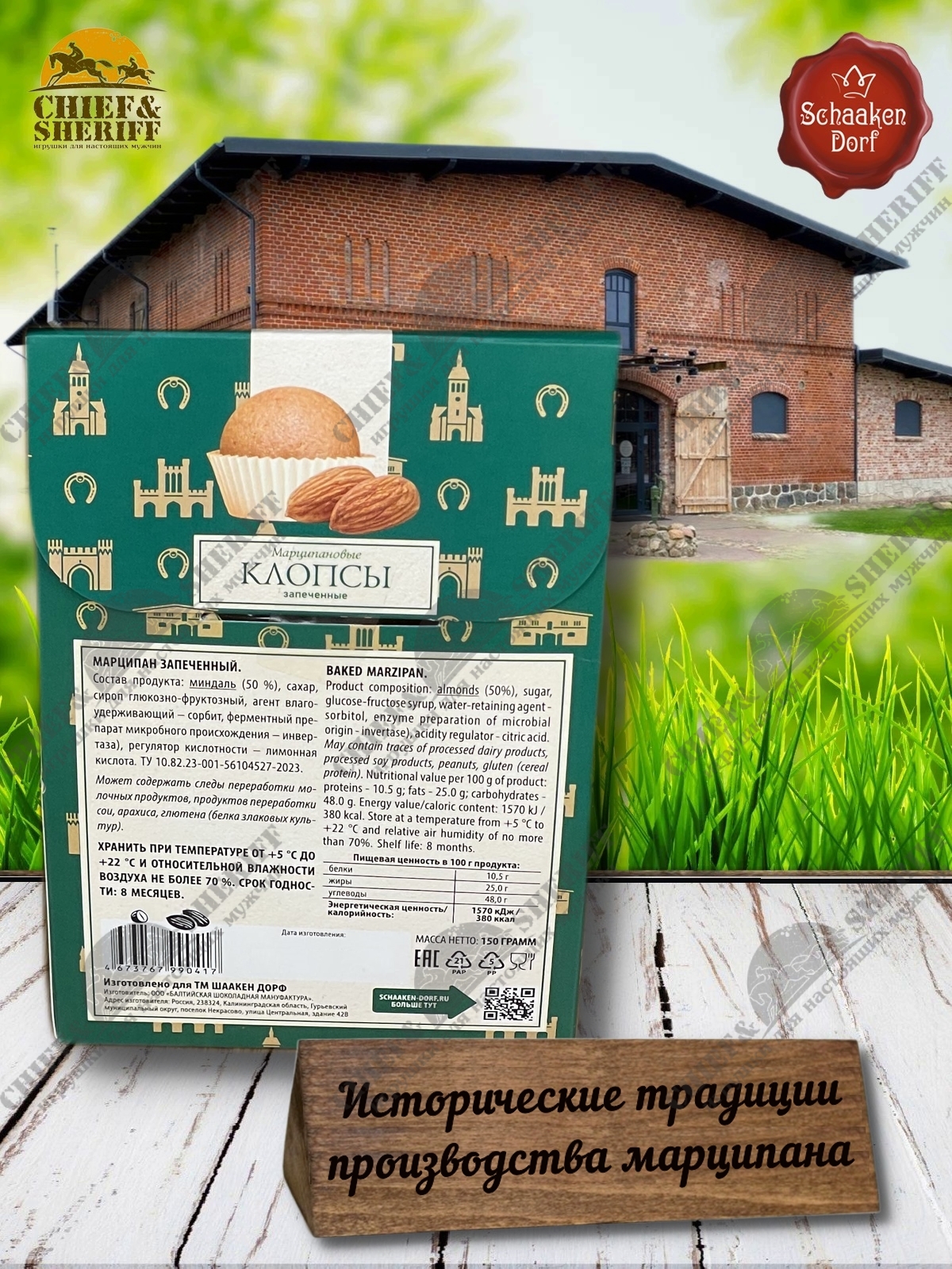 Шаакен Дорф - семейное производство сыра, марципана, шоколада, конфет и зефира. Производство компании Шаакен Дорф находится в Калининграде, в здании, которое когда-то было конюшней при замке Шаакен - рыцарей еще тевтонского ордена. Сейчас на первом этаже находится производство сыра. На втором этаже располагается небольшое кондитерское производство. Здесь вручную варится зефир, делаются карамелизированные апельсины в темном шоколаде, сублимированные ягоды, а также создается абсолютно разный и такой всеми полюбившийся калининградский марципан. В 2024 году, компания Шаакен Дорф стала победителем в номинациях «Лучшее туристическое направление года в номинации агротуризм», «Лучшее крестьянско-фермерское хозяйство», «Лучшее хозяйство в отрасли переработки молока», «Лучший объект туристического показа» и многих других! Марципан от Schaaken Dorf как минимум не уступает по качеству немецкому марципану от лучших производителей марципана из Германии. Попробуйте - и убедитесь сами!