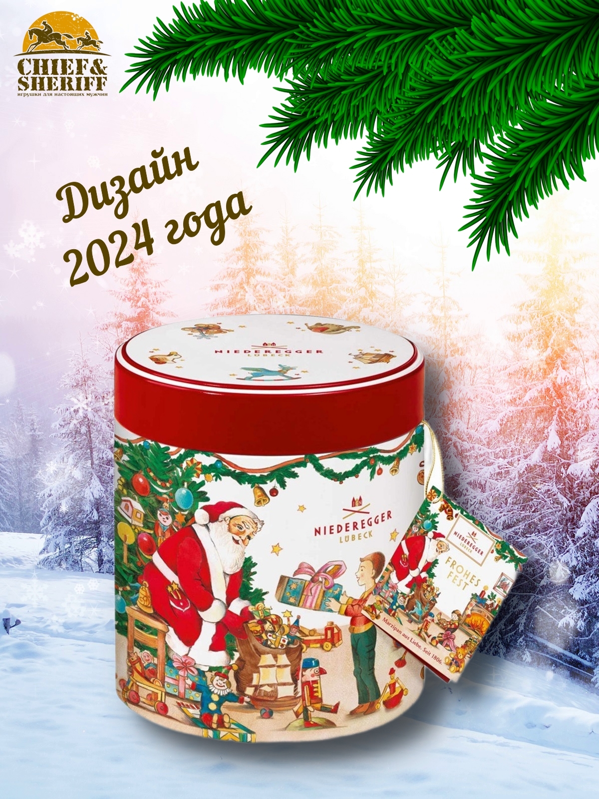 Подарочный набор конфет в новогоднем стиле с марципаном от Niederegger – это изысканное лакомство, которое станет отличным подарком для сладкоежек и любителей качественных кондитерских изделий. В металлической банке вы найдете  20 классических марципановых конфет в темном шоколаде, дарящих незабываемый вкус и аромат.