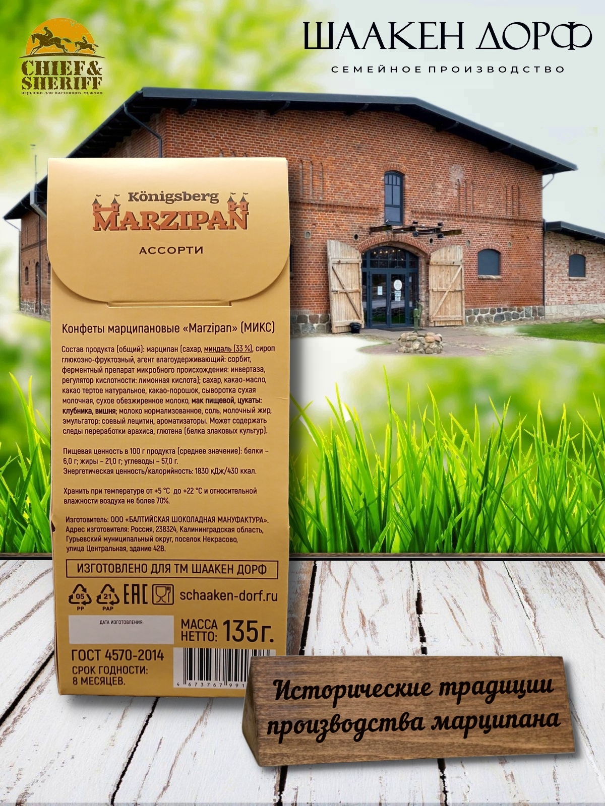 Насладитесь неповторимыми вкусами ассорти калининградских конфет Марципан в шоколаде от SCHAAKEN DORF.  Каждая шоколадная конфета — это шедевр кондитерского искусства, который порадует как гурманов, так и любителей сладкого, а яркий пакет с изображением Королевских ворот в Калининграде всколыхнет приятные воспоминания и настроит на нужный гастрономический лад.
