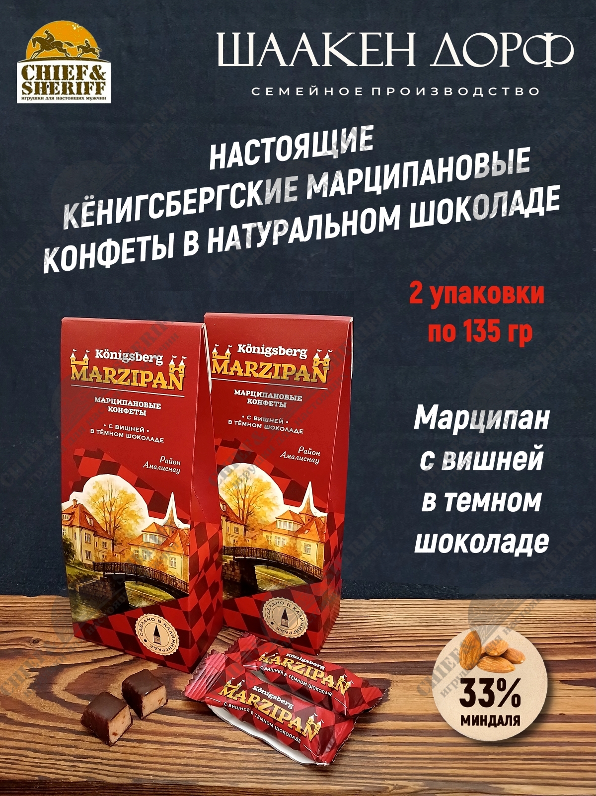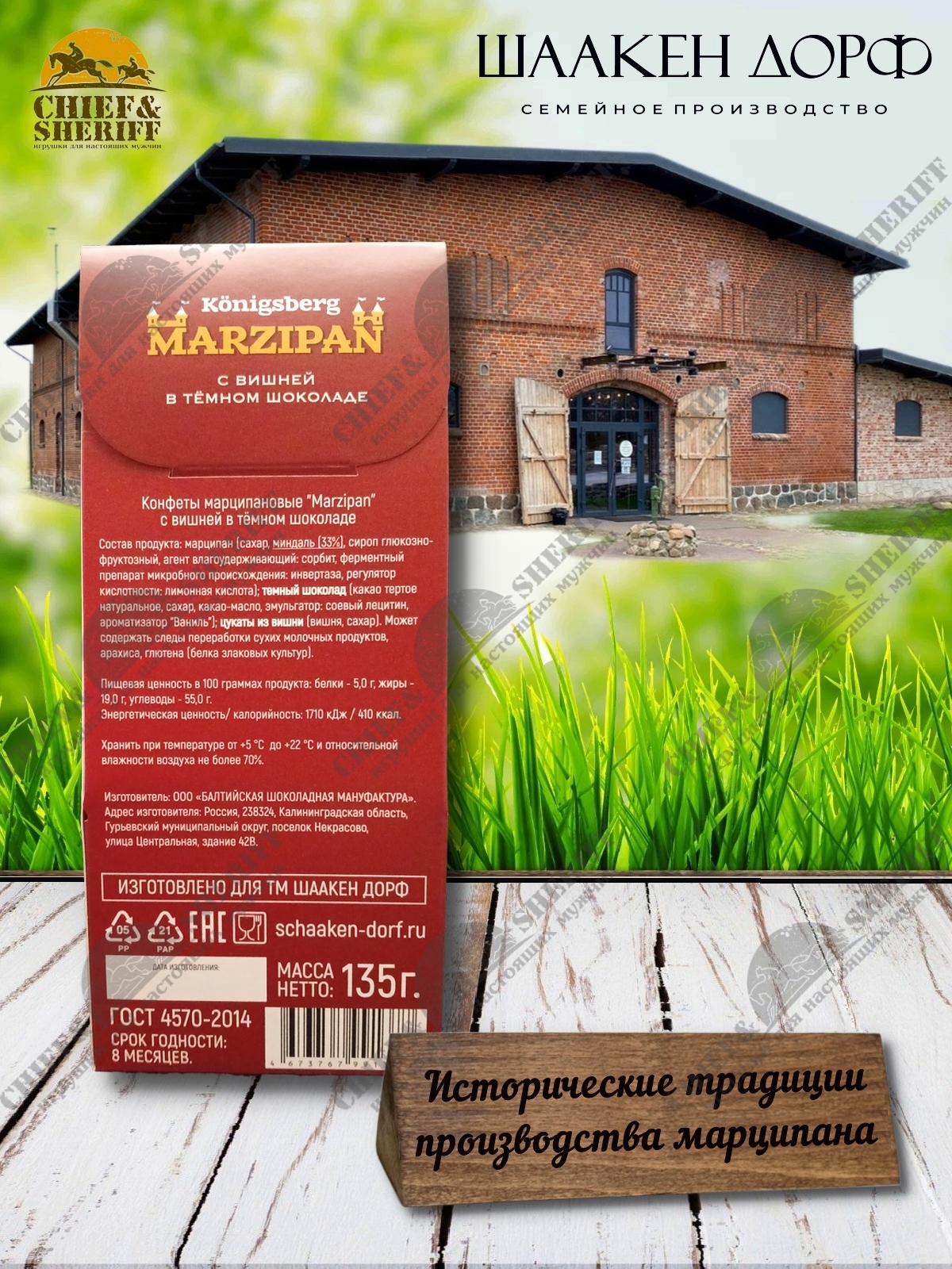 Покупая калининградские конфеты Марципан в темном шоколаде с вишней, вы выбираете качество, богатство вкусов и традиции, которые передаются из поколения в поколение. Марципан изготовлен компанией Schaaken Dorf. Шаакен Дорф - семейное производство сыра, марципана, шоколада, конфет и зефира, которое находится в Калининграде, в здании, которое когда-то было конюшней при замке Шаакен. В 2024 году, компания Шаакен Дорф стала победителем в номинациях «Лучшее туристическое направление года в номинации агротуризм», «Лучшее крестьянско-фермерское хозяйство» и многих других!