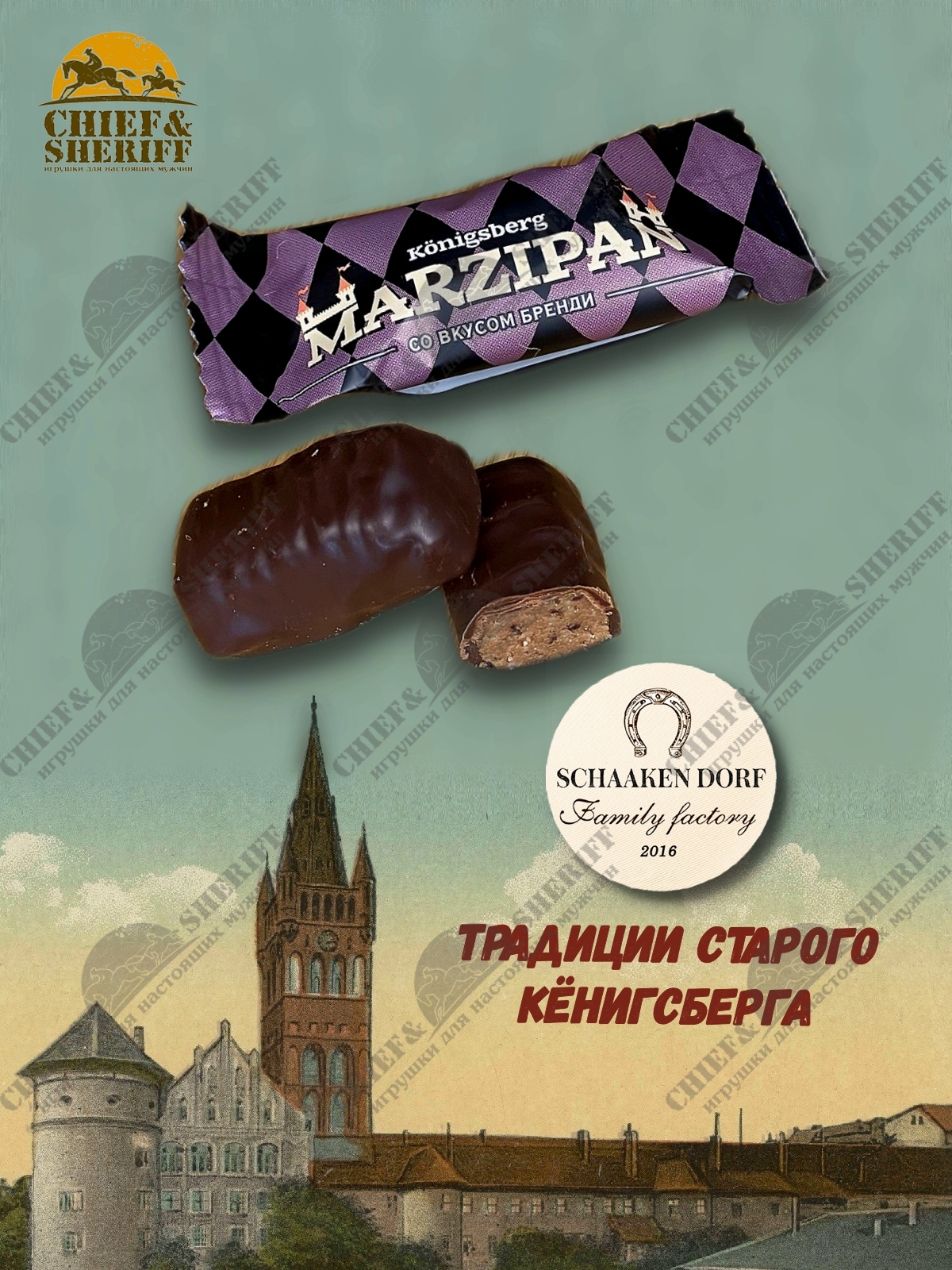 Покупая калининградские конфеты Марципан со вкусом бренди в темном шоколаде, вы выбираете качество, богатство вкусов и традиции, которые передаются из поколения в поколение. Марципан изготовлен компанией Schaaken Dorf. Шаакен Дорф - семейное производство сыра, марципана, шоколада, конфет и зефира, которое находится в Калининграде, в здании, которое когда-то было конюшней при замке Шаакен. В 2024 году, компания Шаакен Дорф стала победителем в номинациях «Лучшее туристическое направление года в номинации агротуризм», «Лучшее крестьянско-фермерское хозяйство» и многих других!