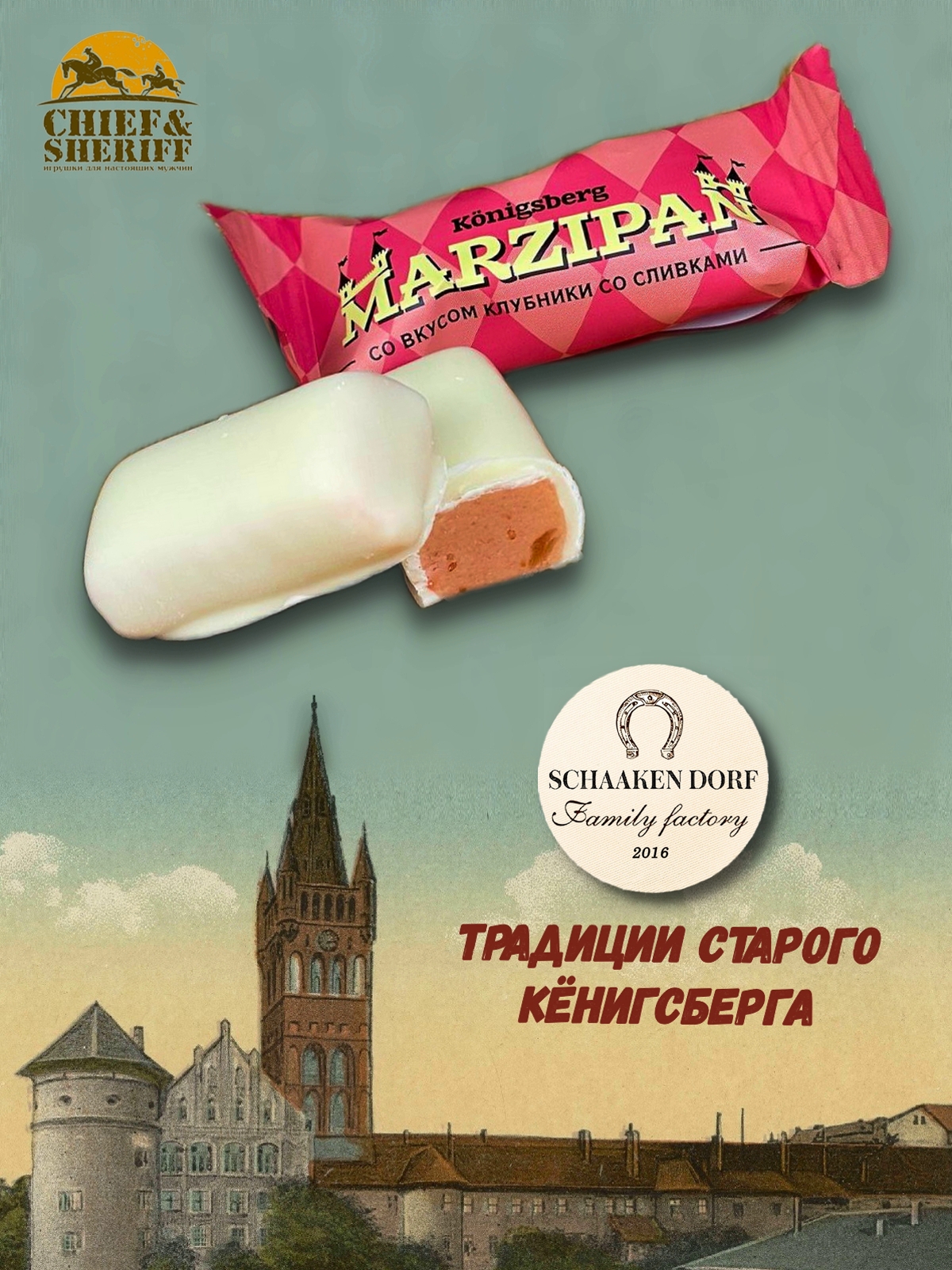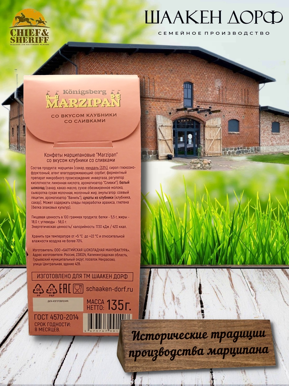 Покупая калининградские конфеты Марципан со вкусом клубники со сливками в белом шоколаде, вы выбираете качество, богатство вкусов и традиции, которые передаются из поколения в поколение. Марципан изготовлен компанией Schaaken Dorf. Шаакен Дорф - семейное производство сыра, марципана, шоколада, конфет и зефира, которое находится в Калининграде, в здании, которое когда-то было конюшней при замке Шаакен. В 2024 году, компания Шаакен Дорф стала победителем в номинациях «Лучшее туристическое направление года в номинации агротуризм», «Лучшее крестьянско-фермерское хозяйство» и многих других!