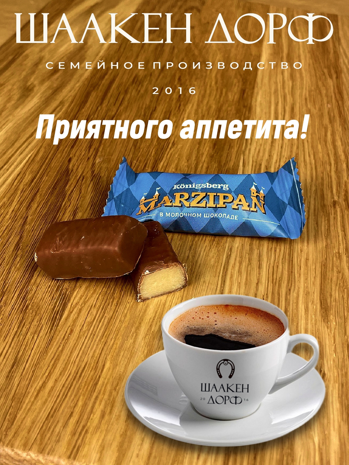 Покупая калининградские конфеты Марципан в молочном шоколаде, вы выбираете качество, богатство вкусов и традиции, которые передаются из поколения в поколение. Марципан изготовлен компанией Schaaken Dorf. Шаакен Дорф - семейное производство сыра, марципана, шоколада, конфет и зефира, которое находится в Калининграде, в здании, которое когда-то было конюшней при замке Шаакен. В 2024 году, компания Шаакен Дорф стала победителем в номинациях «Лучшее туристическое направление года в номинации агротуризм», «Лучшее крестьянско-фермерское хозяйство» и многих других!
