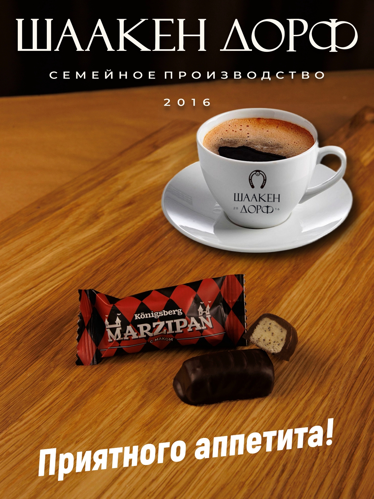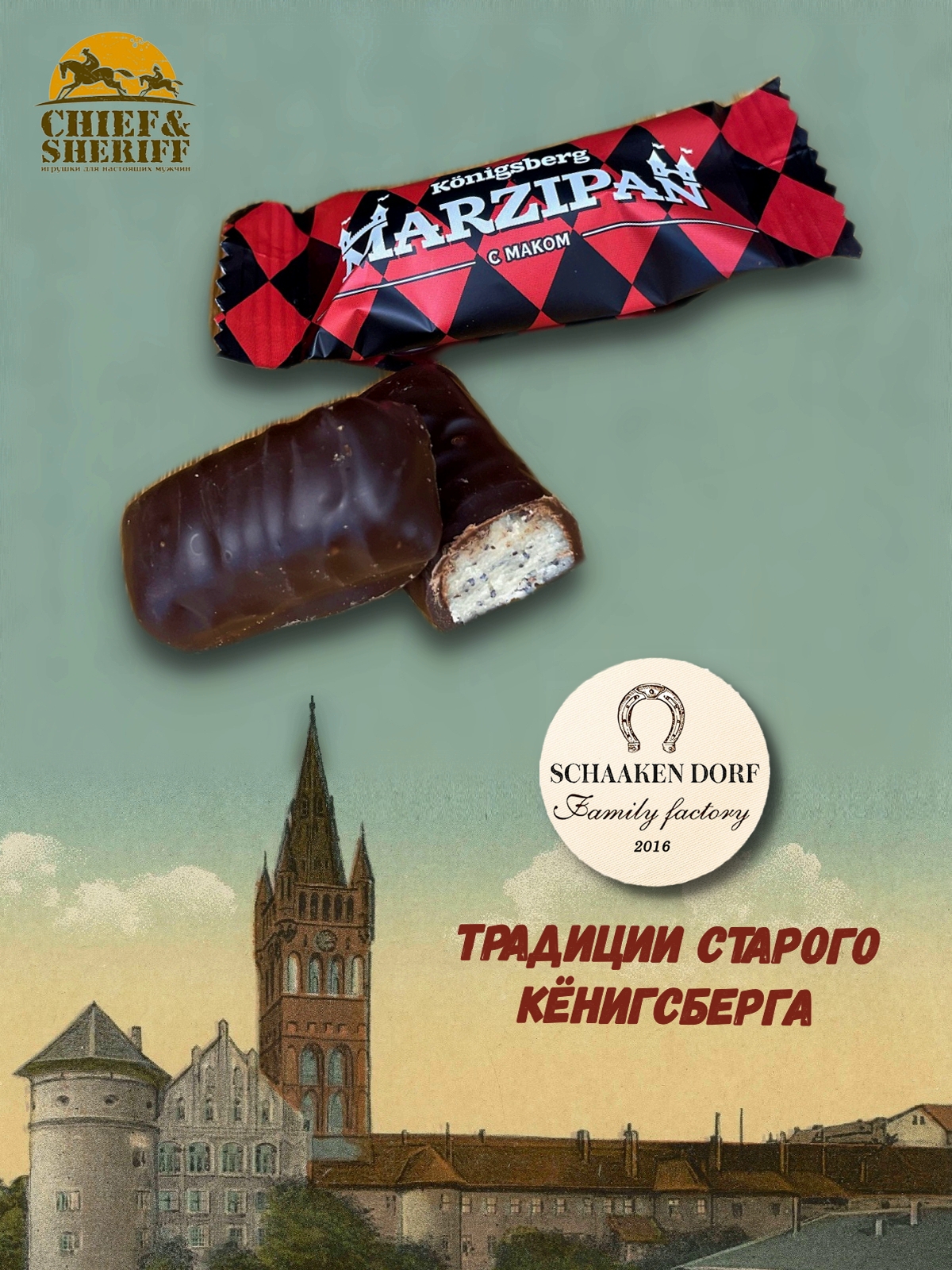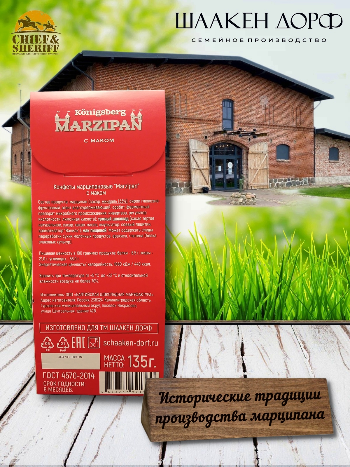 Покупая калининградские конфеты Марципан в темном шоколаде с маком, вы выбираете качество, богатство вкусов и традиции, которые передаются из поколения в поколение. Марципан изготовлен компанией Schaaken Dorf. Шаакен Дорф - семейное производство сыра, марципана, шоколада, конфет и зефира, которое находится в Калининграде, в здании, которое когда-то было конюшней при замке Шаакен. В 2024 году, компания Шаакен Дорф стала победителем в номинациях «Лучшее туристическое направление года в номинации агротуризм», «Лучшее крестьянско-фермерское хозяйство» и многих других!