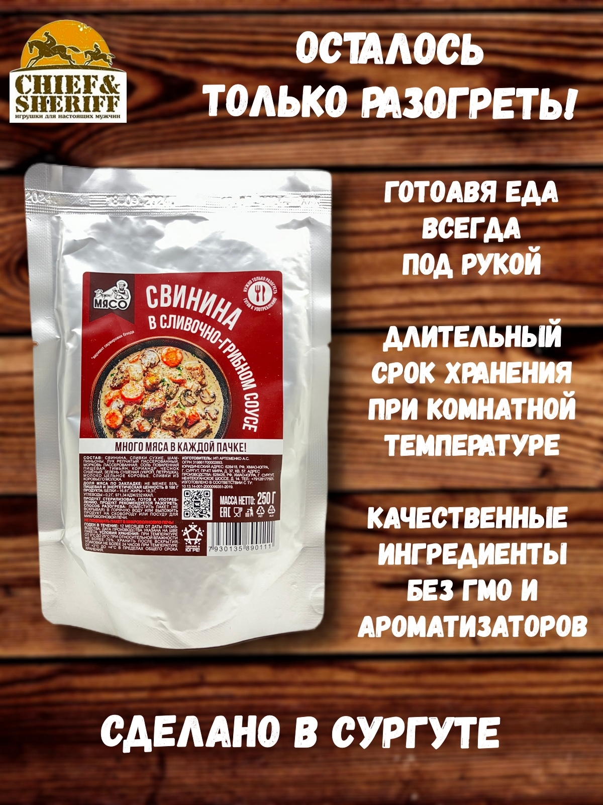 Свинина в сливочно-грибном соусе от бренда "Вкусно! МЯСО" представляет собой полностью готовое к употреблению блюдо, идеальное для тех, кто ценит вкус и качество. Этот продукт создан исключительно из натуральных ингредиентов в Сургуте, что гарантирует его высокое качество и свежесть. Свинина, шампиньоны, лук, морковь, а также ароматные травы и специи сочетаются в уникальном сливочно-грибном соусе, создавая неповторимый вкус.