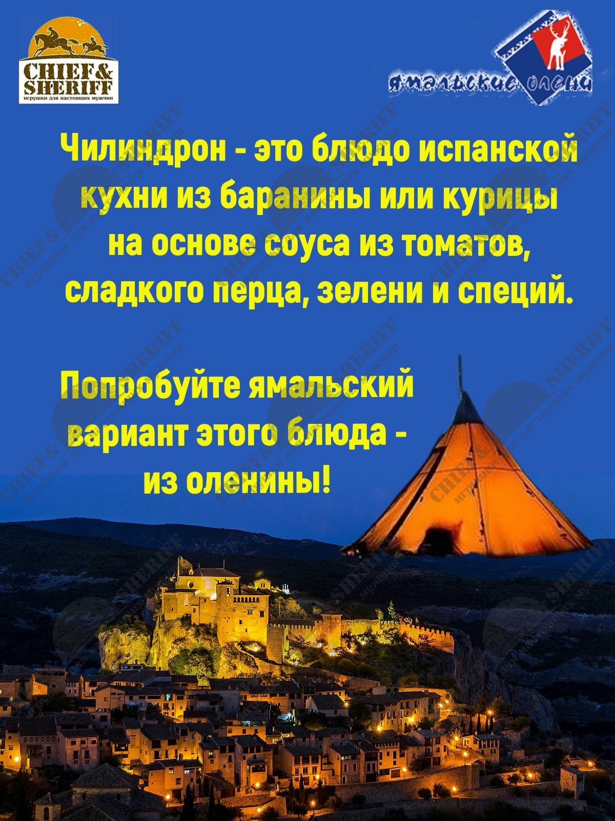 Чилиндрон - это блюдо северо-испанской кухни (Наварра, Арагон, Баскония). В Испании оно готовится из баранины или курицы на основе одноименного густого соуса из томатов, сладкого перца, зелени и специй. Предлагаем вам попробовать ямальльское прочтение этого блюда!