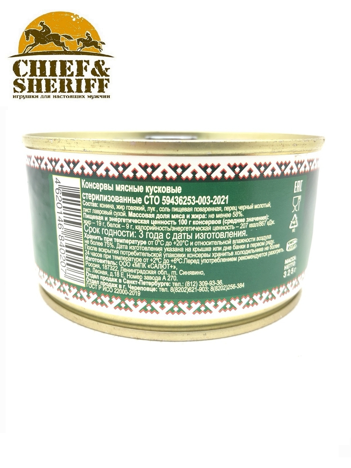 "Балтийская охота" представляет тушеную конину в собственном соку. Продукт изготовлен из качественного мяса конины, что гарантирует его вкус и питательность. Состав консервов включает в себя конину, жир, лук, поваренную соль, черный перец и лавровый лист. Благодаря такому составу, консервы обладают насыщенным вкусом и ароматом, а также содержат все необходимые для организма человека вещества. Упаковка консервов выполнена в виде консервной банки, что обеспечивает сохранность продукта в процессе хранения и транспортировки. Таким образом, тушёнка из конины "Балтийская охота" являются отличным выбором для тех, кто ценит качество и вкус мясных продуктов.