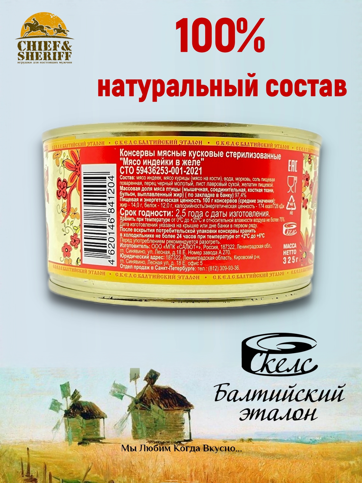 Мясо индейки в желе от Балтийский эталон - это высококачественный продукт, который придется по вкусу любителям мясных консервов. Мясо индейки в желе содержит только натуральные ингредиенты: мясо индейки, морковь, соль, черный перец и лавровый лист. Благодаря этому, продукт обладает насыщенным вкусом и ароматом, а также содержит все необходимые для организма человека витамины и минералы. Тушёнка из индейки в упакована в консервные банки, что обеспечивает сохранность и удобство хранения. Продукт готов к употреблению. Мясо индейки в желе от Балтийский эталон станет отличным дополнением к вашему столу, а также подойдет для приготовления разнообразных блюд.