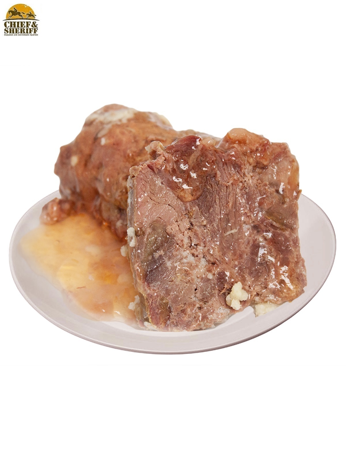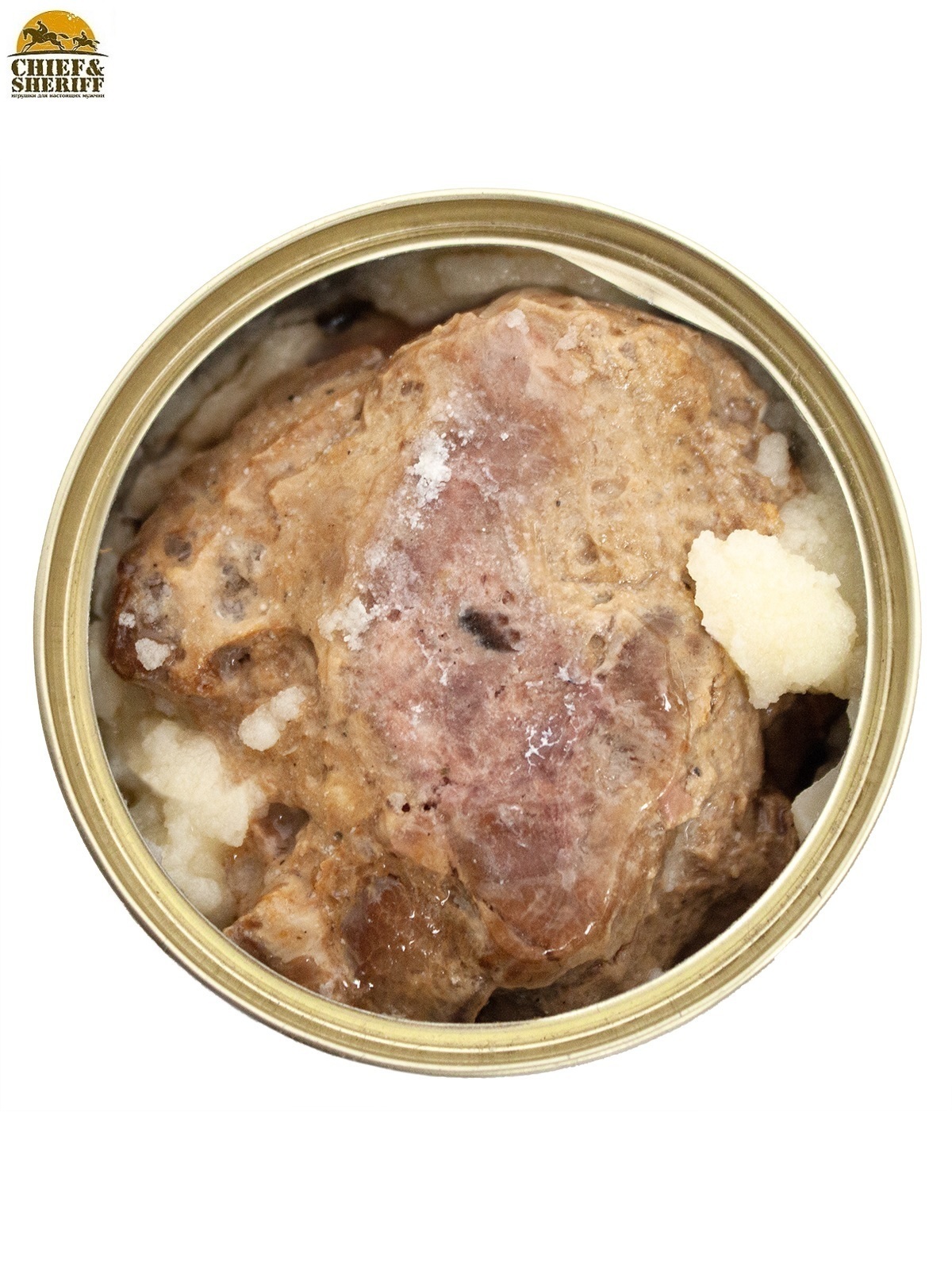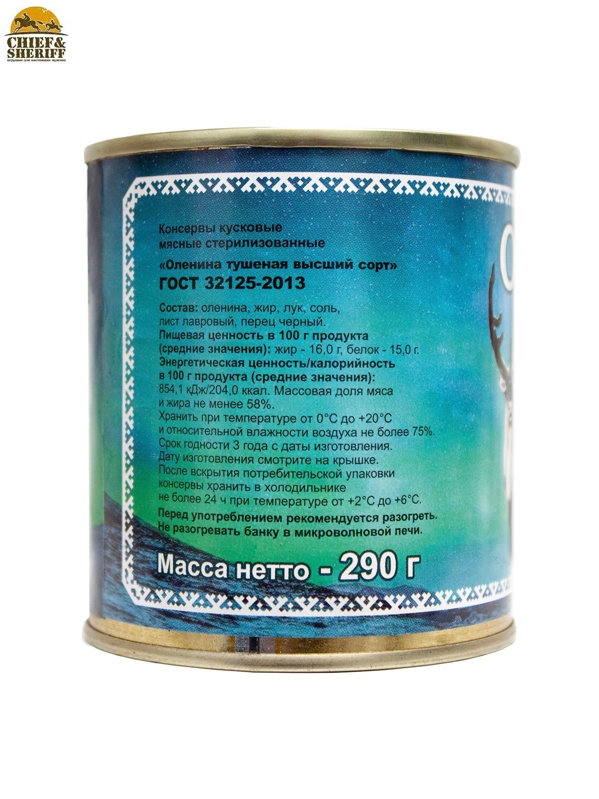 Оленина — молодое мясо оленя, одомашненного в северных краях Заполярья. При этом животное продолжает жить и питаться на воле. Цвет и волокнистость оленьего мяса напоминает говяжье. Более мягкое и нежное, присутствует небольшой специфический запах. Диетический продукт — содержит 80 ккал на 100 г. Богато белком, витаминами группы В, фолиевой кислотой, микро- и макроэлементами: железом, фосфором, магнием, калием. Консервированная тушенка из оленины хранится около трех лет, а прочная жестяная банка не деформируется и позволяет брать питательную добавку к каше в длительные походы.Тушенка из оленины, будет незаменима в похоже, на даче.