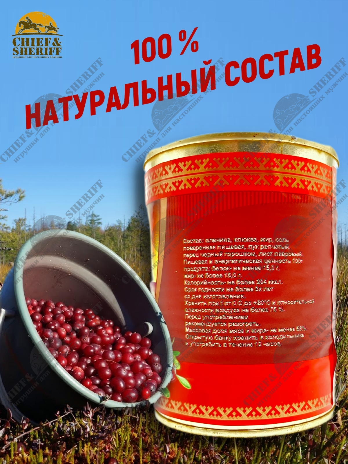 Состав оленина, клюква, жир, соль поваренная пищевая, лук репчатый, перец чёрный горошком, лист лавровый