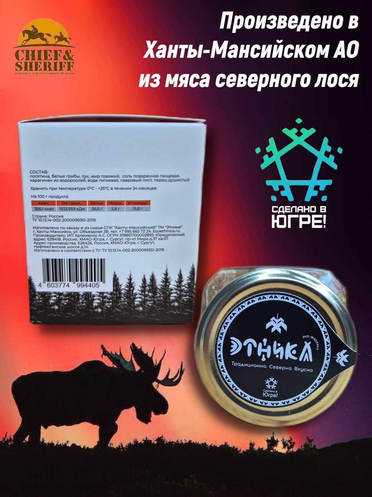 Состав лосятина,белые грибы,лук,жир говяжий,соль,карагинан из водорослей,вода,лавровый лист,перец душистый