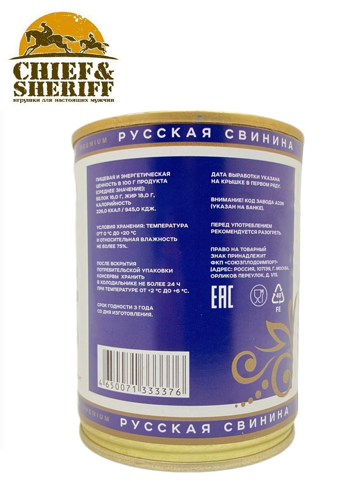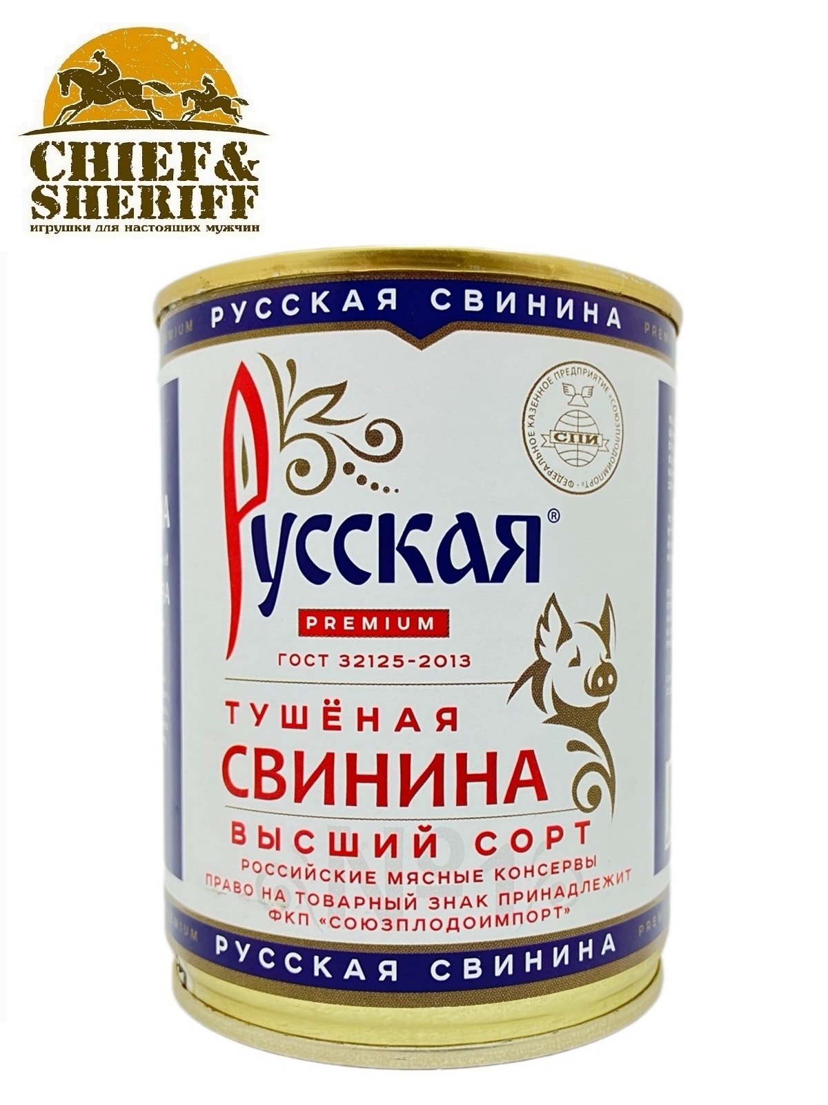 Торговая марка «Русская», выполненная в соответствующей стилистике, отлично известна многим покупателям по другому товару. Теперь под этим узнаваемым брендом также выпускается такой не менее популярный продукт, как тушёнка. Её можно не только употребить по прямому назначению, но и использовать в качестве прикольно-полезного подарка на Новый Год, 23 февраля или на какой-нибудь профессиональный праздник.
