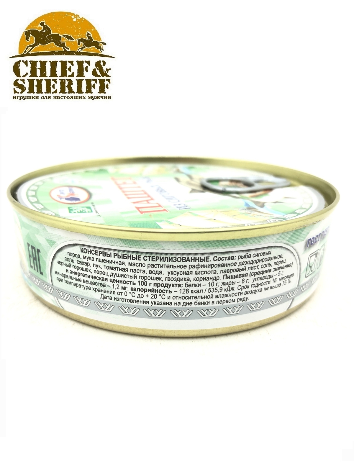 Состав рыбных консервов: рыба сиговых пород, мука пшеничная, масло растительное рафинированное дезодорированное, соль, сахар, лук, томатная паста, вода, уксус, перец чёрный, перец душистый, лавровый лист, гвоздика, кориандр.