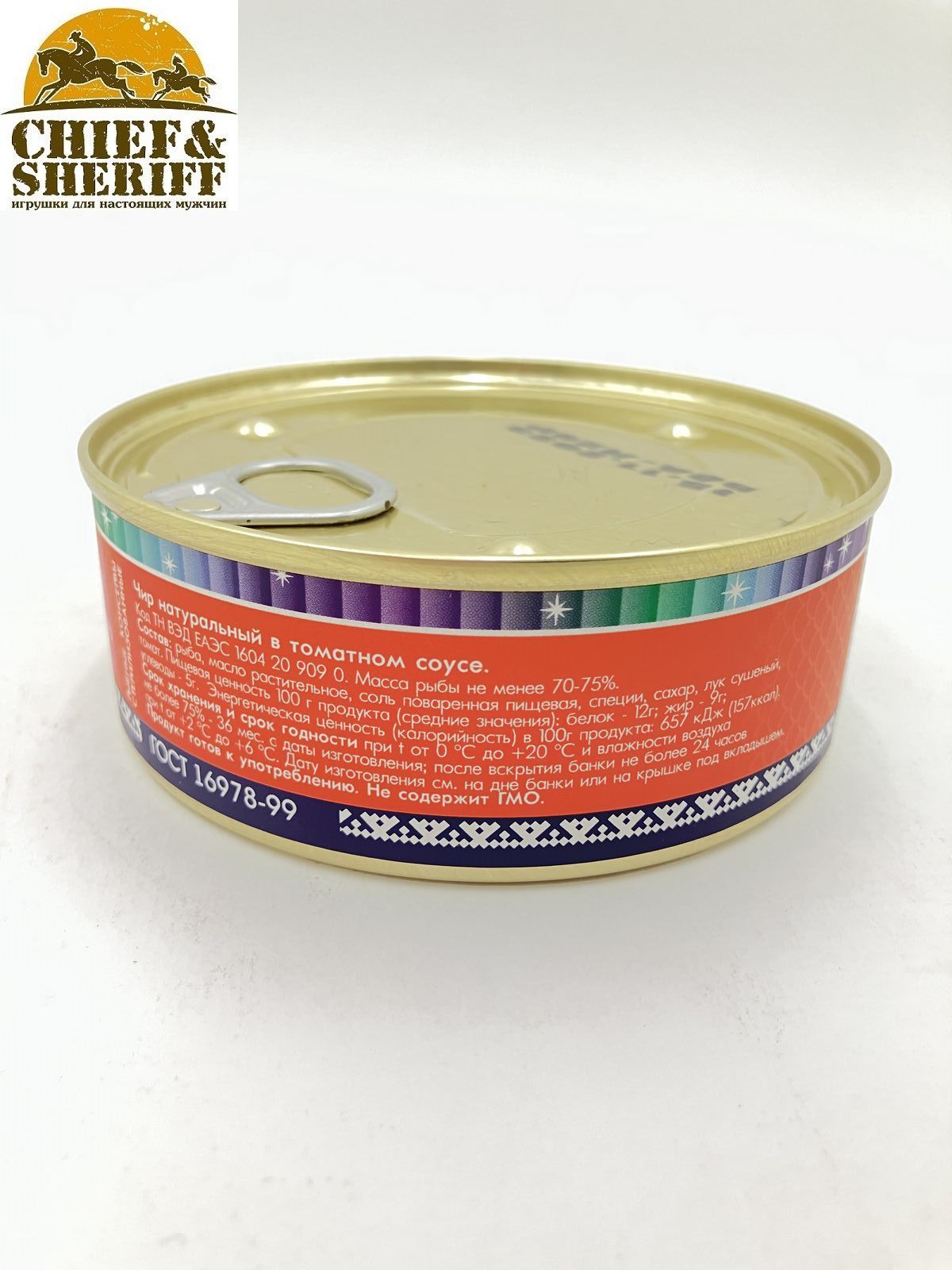 Консервированный натуральный чир в томатном соусе может храниться долго без холодильника. Отлично подойдет для переноски в рюкзаке в дальних походах или как стратегический запас для дома. Плотное наполнение банок и ручная закатка делают продукт высококачественным и вкусным.