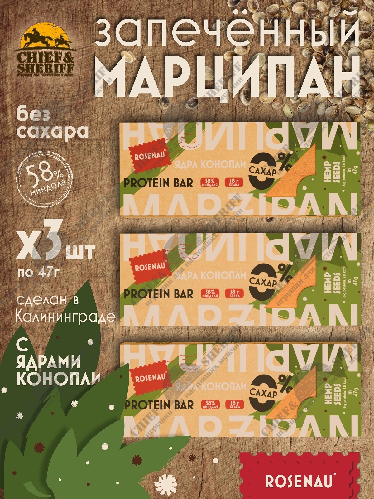 Марципан с ядром конопли запеченный батончик без сахара, ROSENAU, 3 X 47 гр