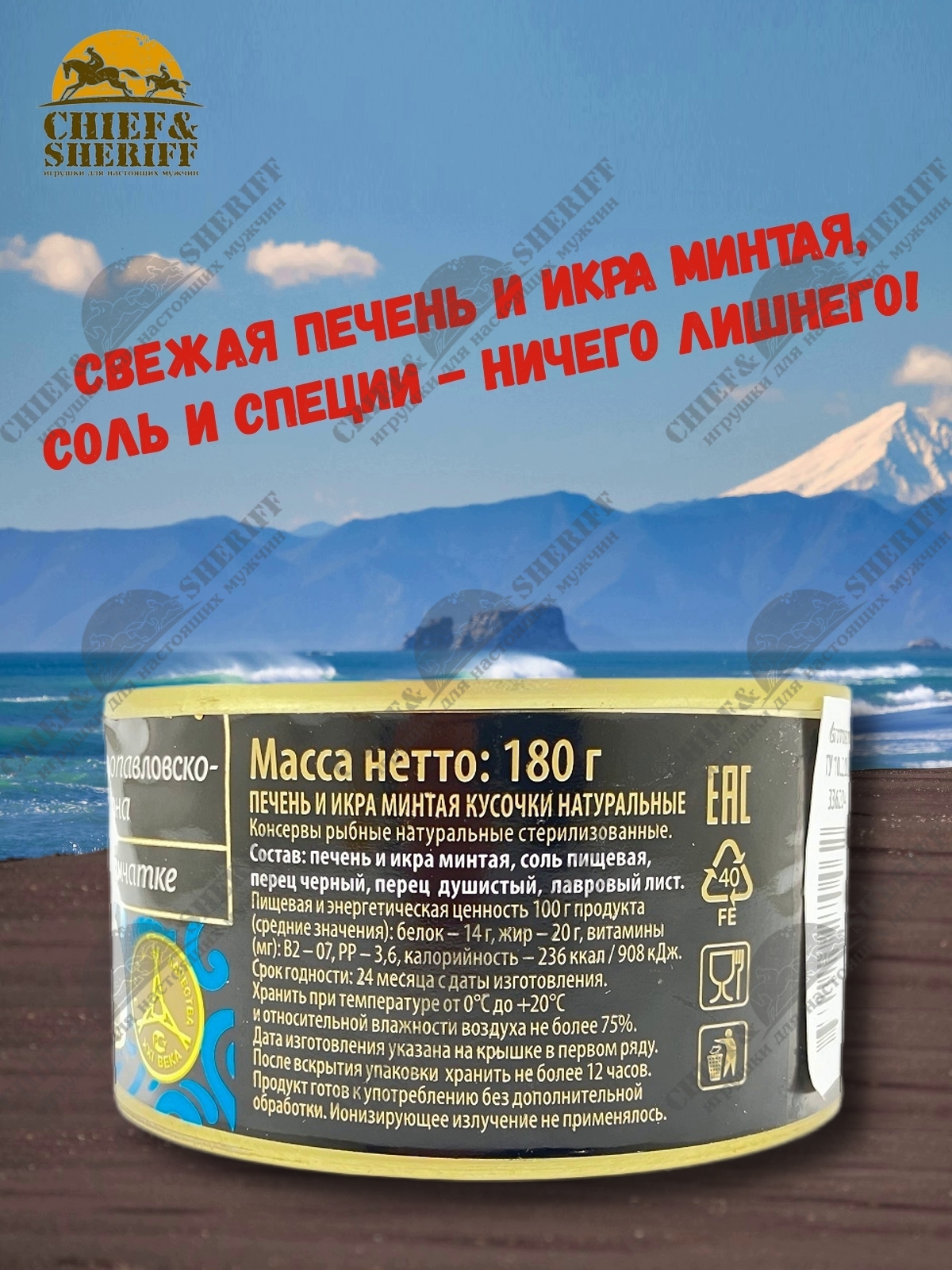 Печень и икра минтая от Устькамчатрыба представляет собой уникальное сочетание печени и икры минтая, предложенное в удобной упаковке по 2 штуки по 180 грамм каждая. Эти консервы рыбные, изготовленные из тресковых пород рыб, отличаются высоким содержанием белка (14 г/100 г) и жиров (20 г/100 г), что делает их идеальным источником питательных веществ. Состав продукта включает в себя только натуральные ингредиенты: печень и икра тресковых пород рыб, соль поваренная, перец чёрный, перец душистый и лавровый лист, что обеспечивает насыщенный и приятный вкус. Консервы подвергаются строгому стерилизационному процессу, что гарантирует их долгосрочное сохранение без потери качества. Это идеальный выбор для тех, кто ценит вкус и качество морских деликатесов, предлагая уникальное сочетание традиционных ингредиентов в современном исполнении. консервы производятся в Камчатском крае из свежайшей рыбы.