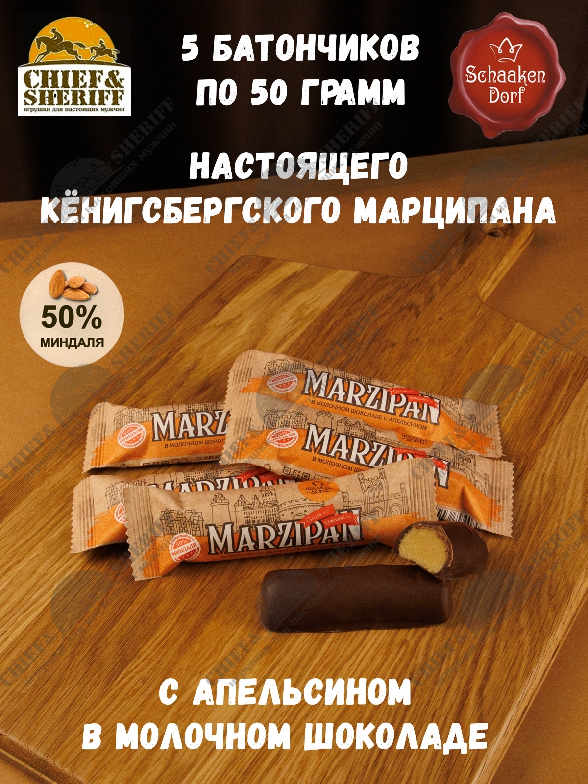 Марципановый батончик в молочном шоколаде с апельсином, SCHAAKEN DORF, 5 X 50 гр Марципановый батончик в молочном шоколаде с апельсином, SCHAAKEN DORF, 5 X 50 гр