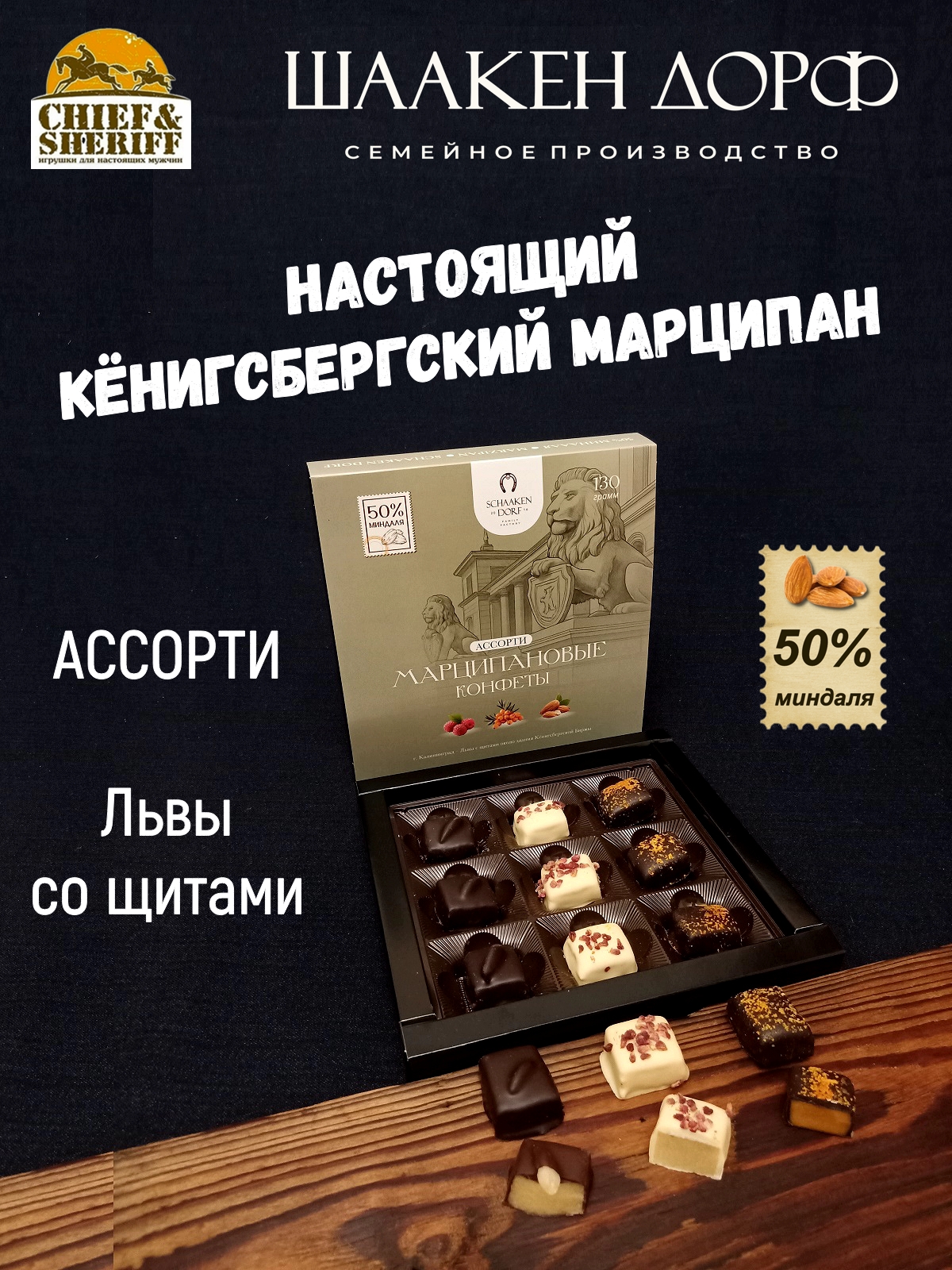 Шоколадные конфеты марципан ассорти "Львы со Щитами", SCHAAKEN DORF, 1 X 130 гр