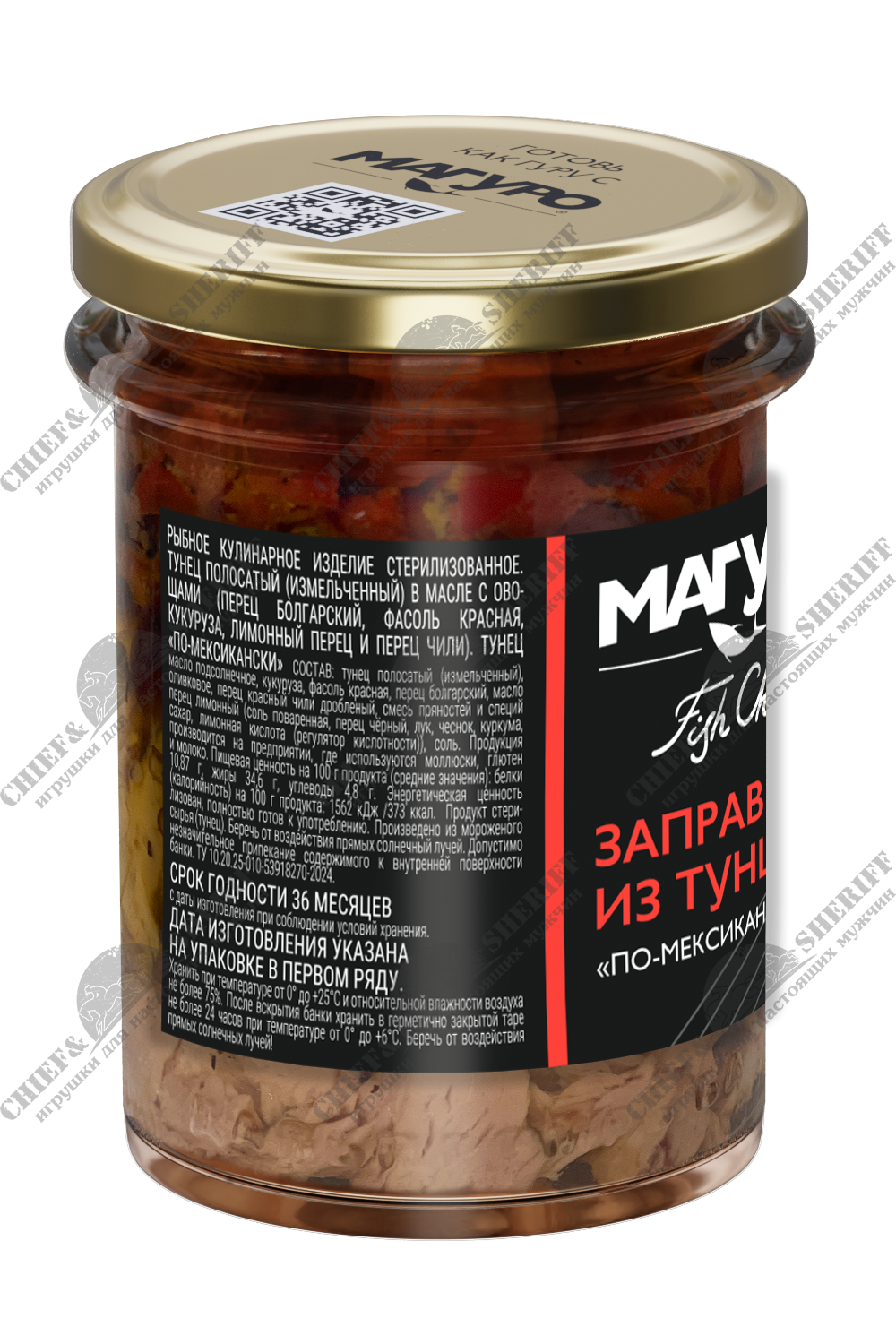 Состав продукта: тунец полосатый (измельченный), масло подсолнечное, кукуруза, фасоль красная, перец болгарский, масло оливковое, перец красный чили дробленый, смесь пряностей и специй перец лимонный (соль поваренная, перец чёрный, лук, чеснок, куркума, сахар, лимонная кислота (регулятор кислотности)), соль.