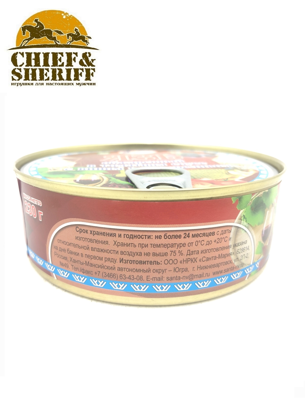 Состав рыбных консервов: рыба язь (кусок), томатный соус (вода питьевая, паста томатная 30%), масло растительное подсолнечное, сахар, 80% уксус, соль поваренная пищевая, лук свежий, перец чёрный, перец душистый, кориандр, гвоздика, лавровый лист, чернослив, мука пшеничная, вино сухое виноградное.