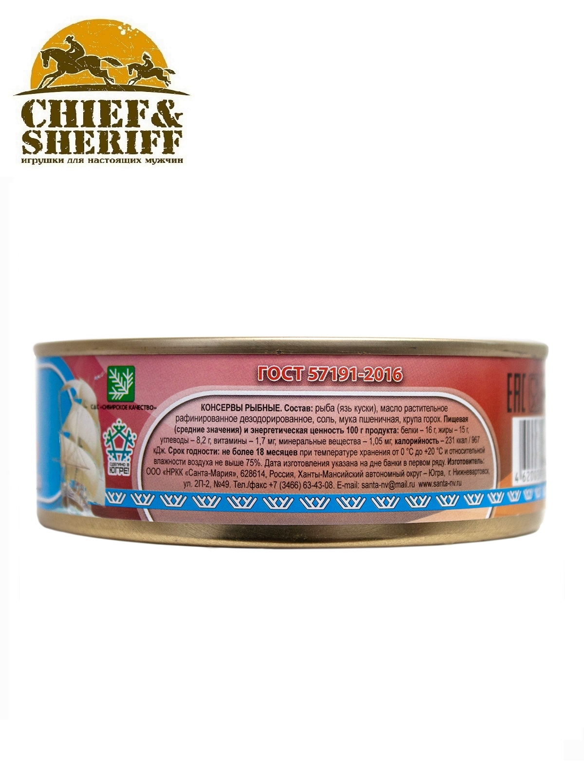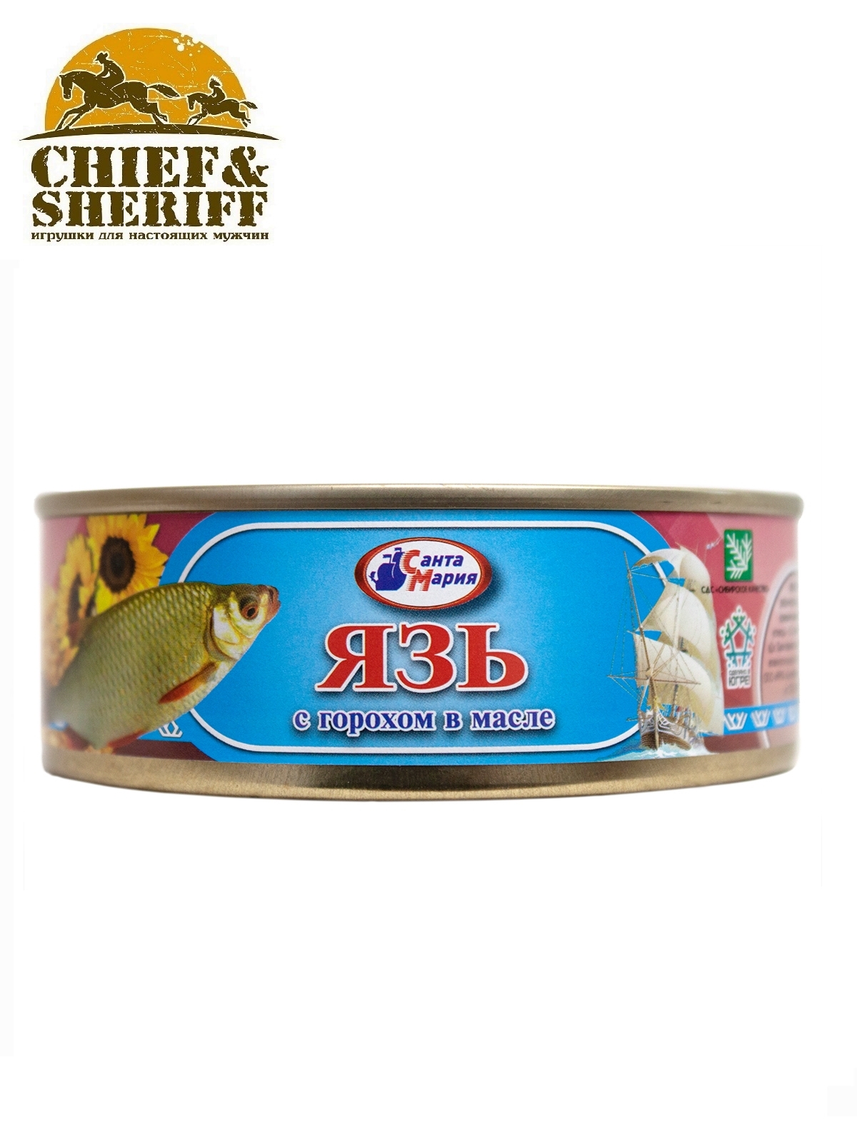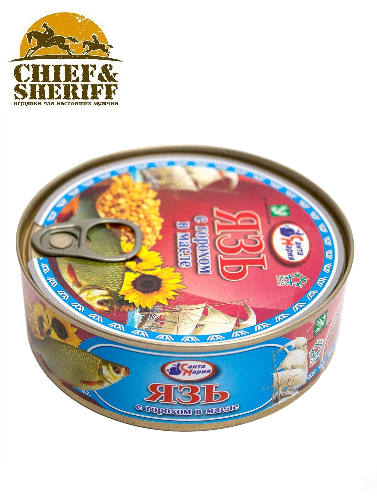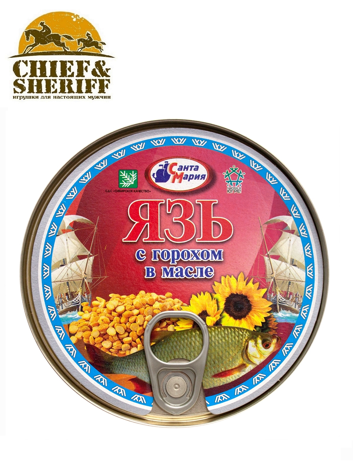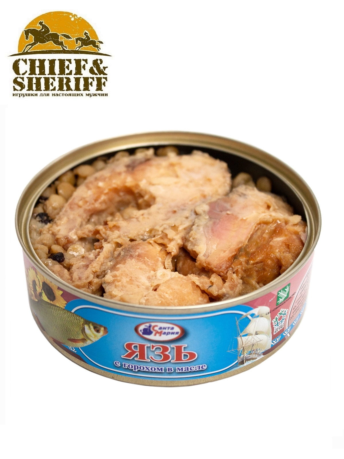 Состав рыбных консервов: рыба язь (кусок), масло растительное рафинированное дезодорированное, соль, мука пшеничная, горох.