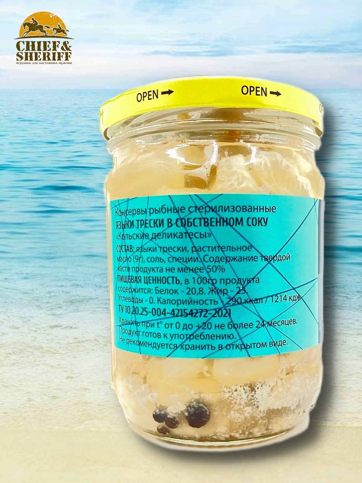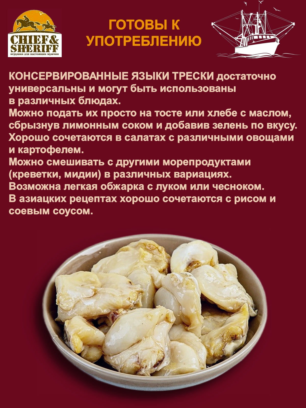 Эти консервы богаты белками, содержание которых составляет 22 грамма на 100 грамм продукта, что делает их отличным источником энергии для организма. Жиры в консервах минимальны, всего 1 грамм на 100 грамм, что подчеркивает их диетические качества. Состав консервов включает в себя языки трески, растительное масло, соль и специи, что обеспечивает их насыщенный вкус и аромат.