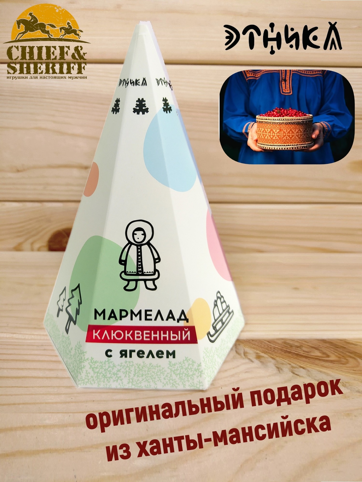 Натуральный мармелад клюквенный с ягелем не оставит равнодушными любителей необычных вкусов и ярких впечатлений. Клюква придает мармеладу насыщенный и яркий вкус, а ягель добавляет легкую горчинку и терпкость. Мармелад поставляется в трех оригинальных коробочках, стилизованных под традиционное жилище северных народов – чум.