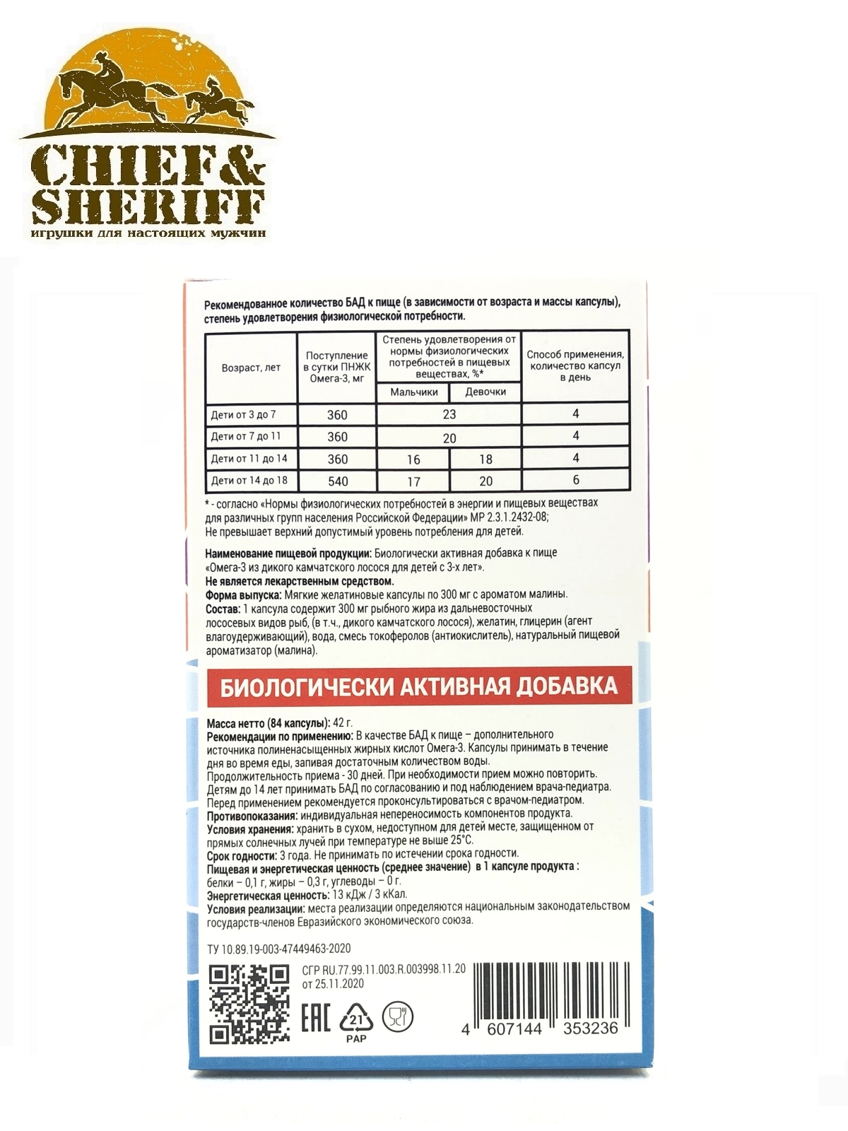Омега-3 от компании Salmonica — натуральная биологически активная добавка для детей от трех лет, содержащая полученный из дикого лосося рыбий жир. Чтобы ребенок не отказывался принимать полезные капсулы, в их состав добавлен ароматизатор со вкусом малины. В одной упаковке — 84 капсулы, принимать их рекомендуется по 1 в день детям до семи лет, по две — детям старше этого возраста и взрослым.