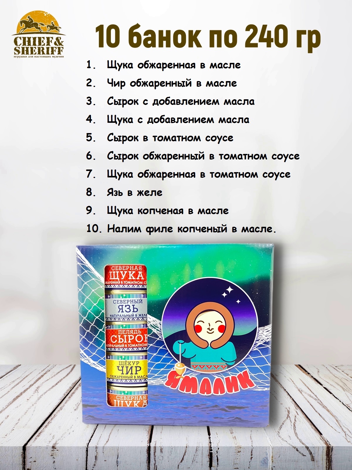 В состав подарочного набора рыбных консервов Ямалик № 2, входит 10 банок рыбных консервов: