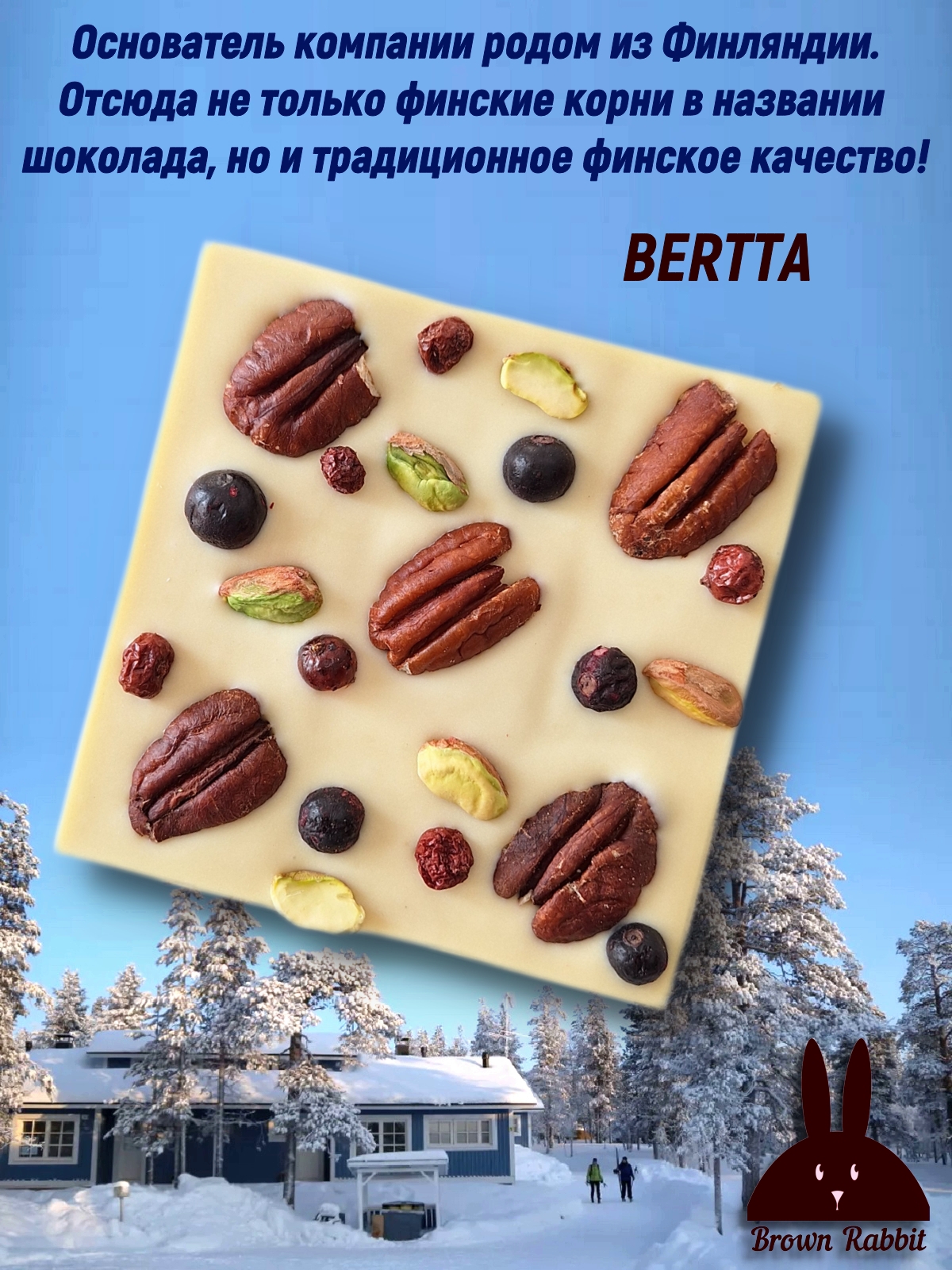 Возможно, вы уже пробовали шоколад с фисташками, шоколад с пеканом или шоколад со смородиной. С шоколадом Бертта мы предлагаем вам насладиться элегантным сочетанием всех этих вкусов! Искренне надеемся, что наш шоколад понравится вам или доставит радость тому, кому вы преподнесете его в подарок - мы очень старались!