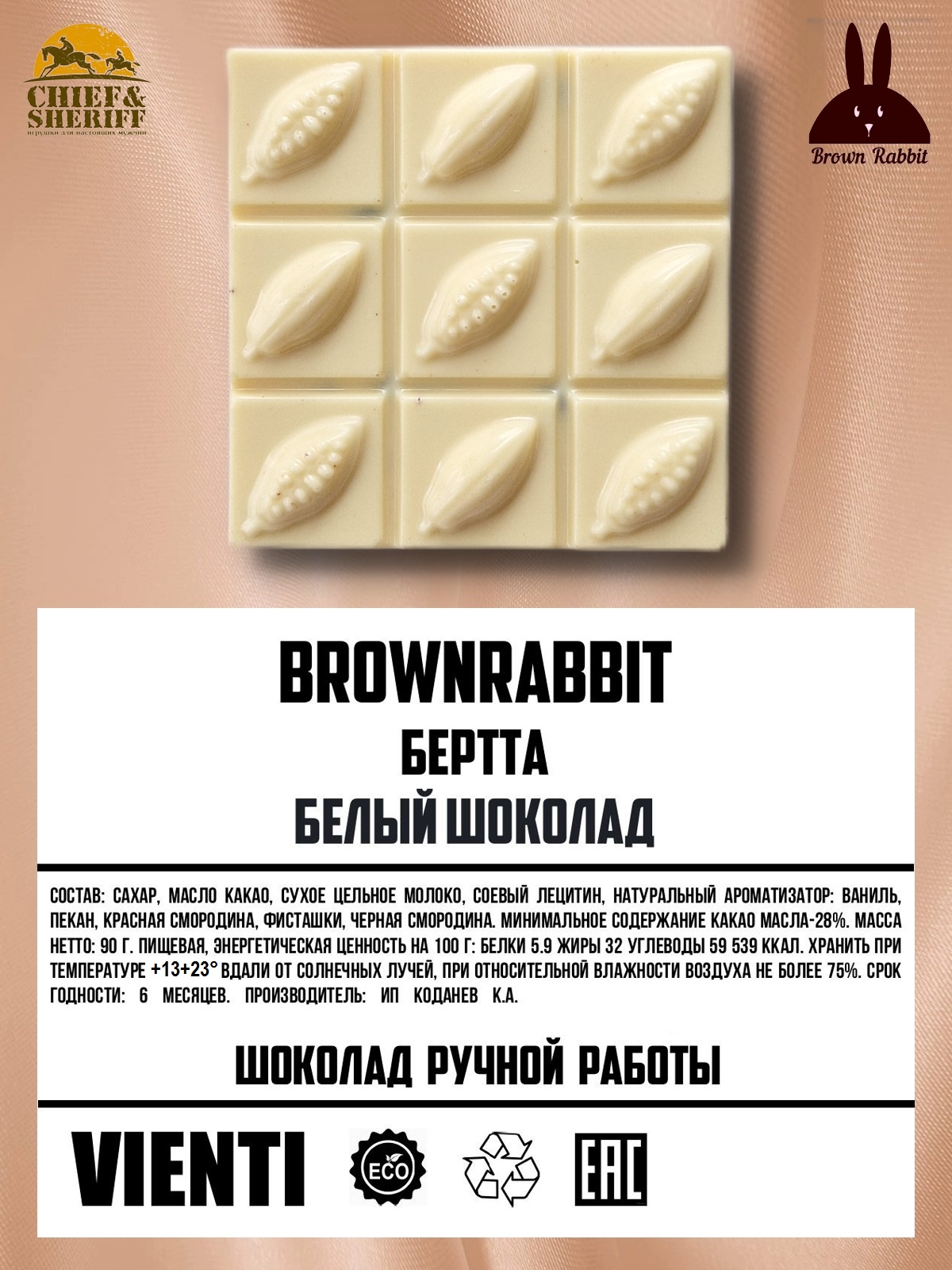 Белый шоколад BЕRTTA от компании Brown Rabbit - это первоклассный натуральный шоколад ручной работы в подарочной крафтовой упаковке.