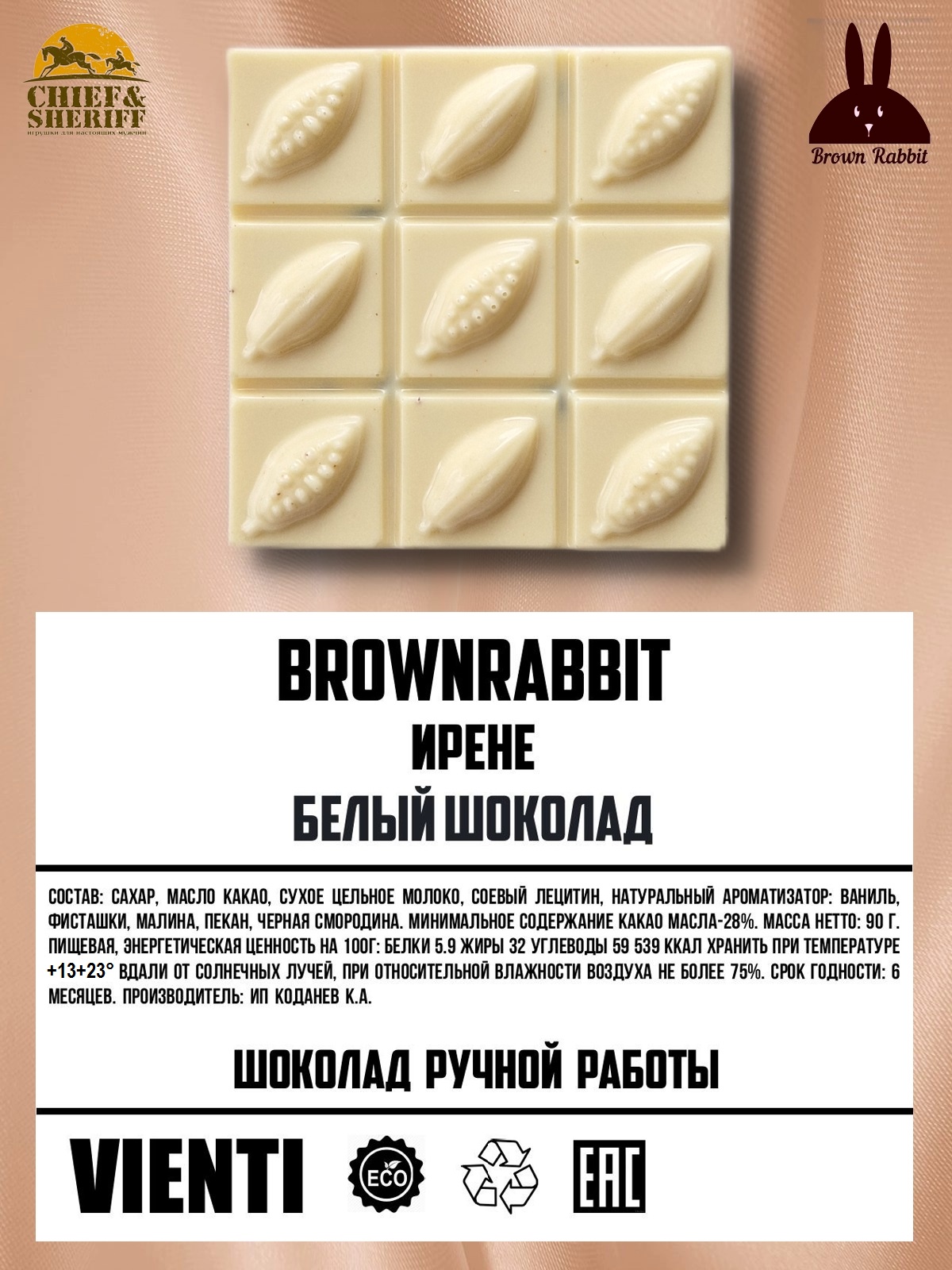 Белый шоколад IRENE от компании Brown Rabbit - это первоклассный натуральный шоколад ручной работы в подарочной крафтовой упаковке.