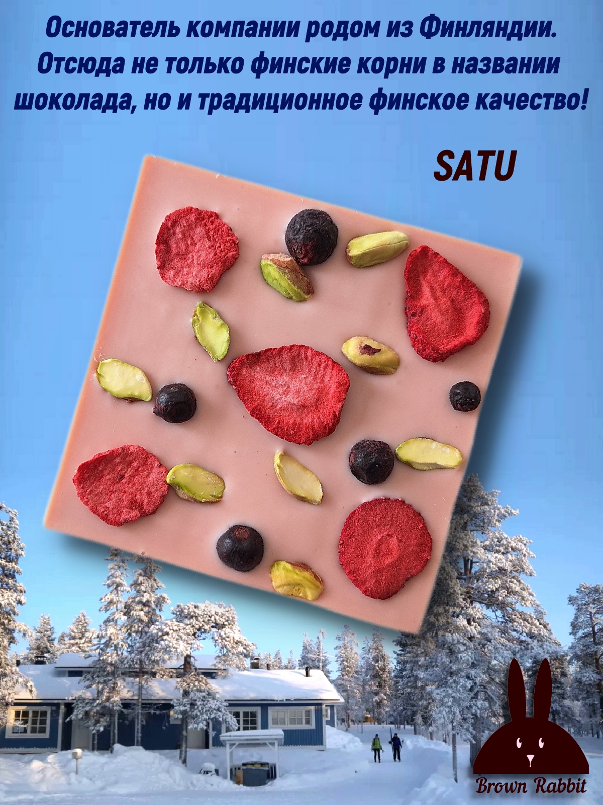 Возможно, вы уже пробовали шоколад с клубникой, шоколад с фисташками или шоколад с черной смородиной. С шоколадом Сату мы предлагаем вам насладиться элегантным сочетанием всех этих вкусов! Искренне надеемся, что наш шоколад понравится вам или доставит радость тому, кому вы преподнесете его в подарок - мы очень старались!