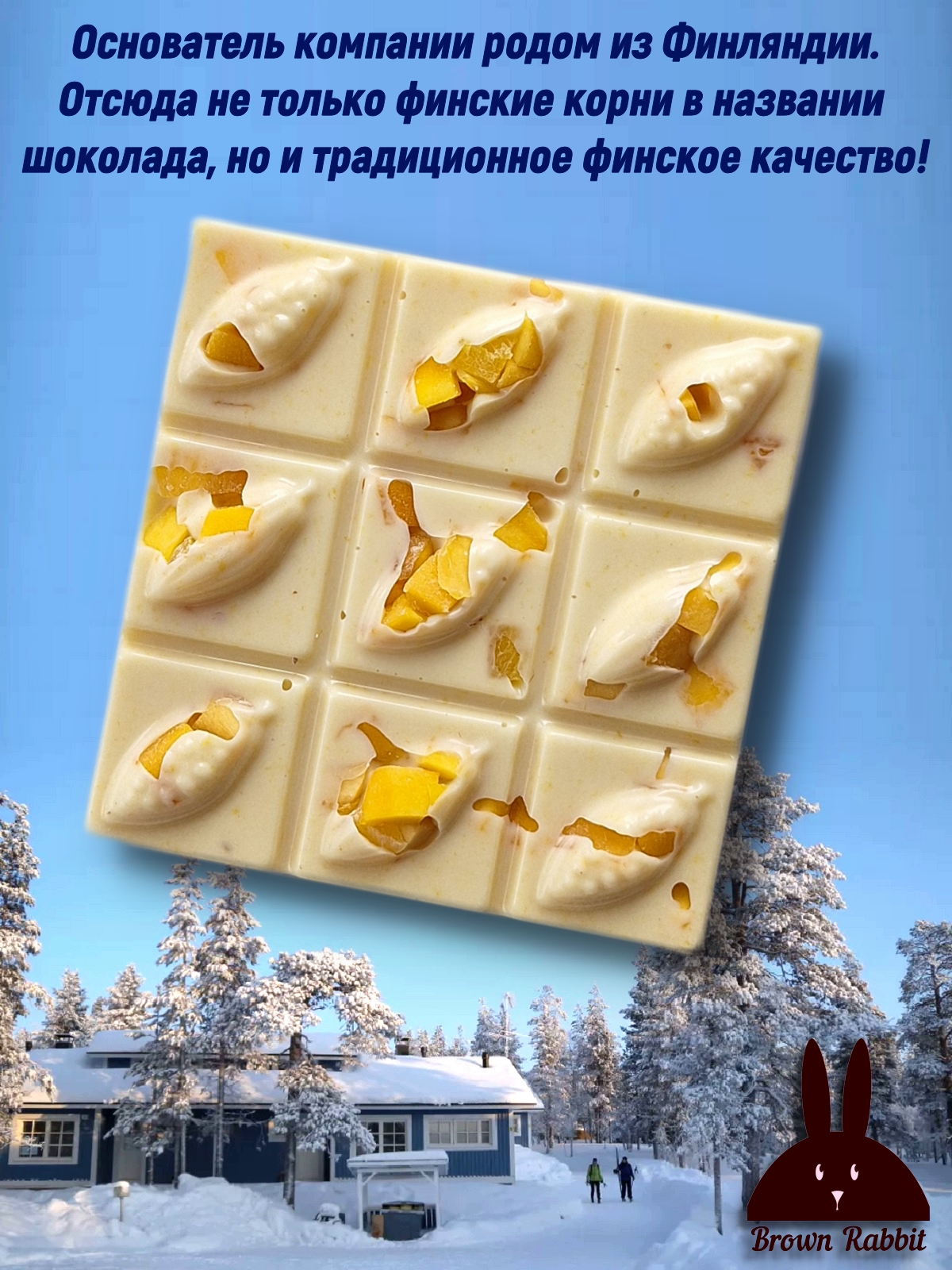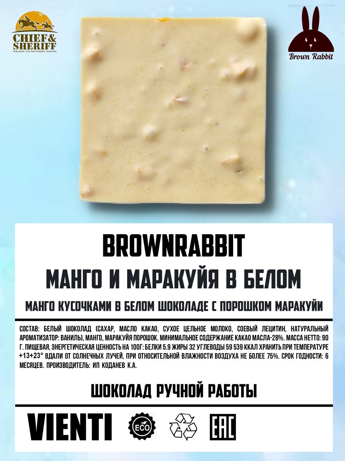 Манго в белом шоколаде с порошком маракуйи от компании Brown Rabbit - это первоклассный натуральный шоколад ручной работы в подарочной крафтовой упаковке.