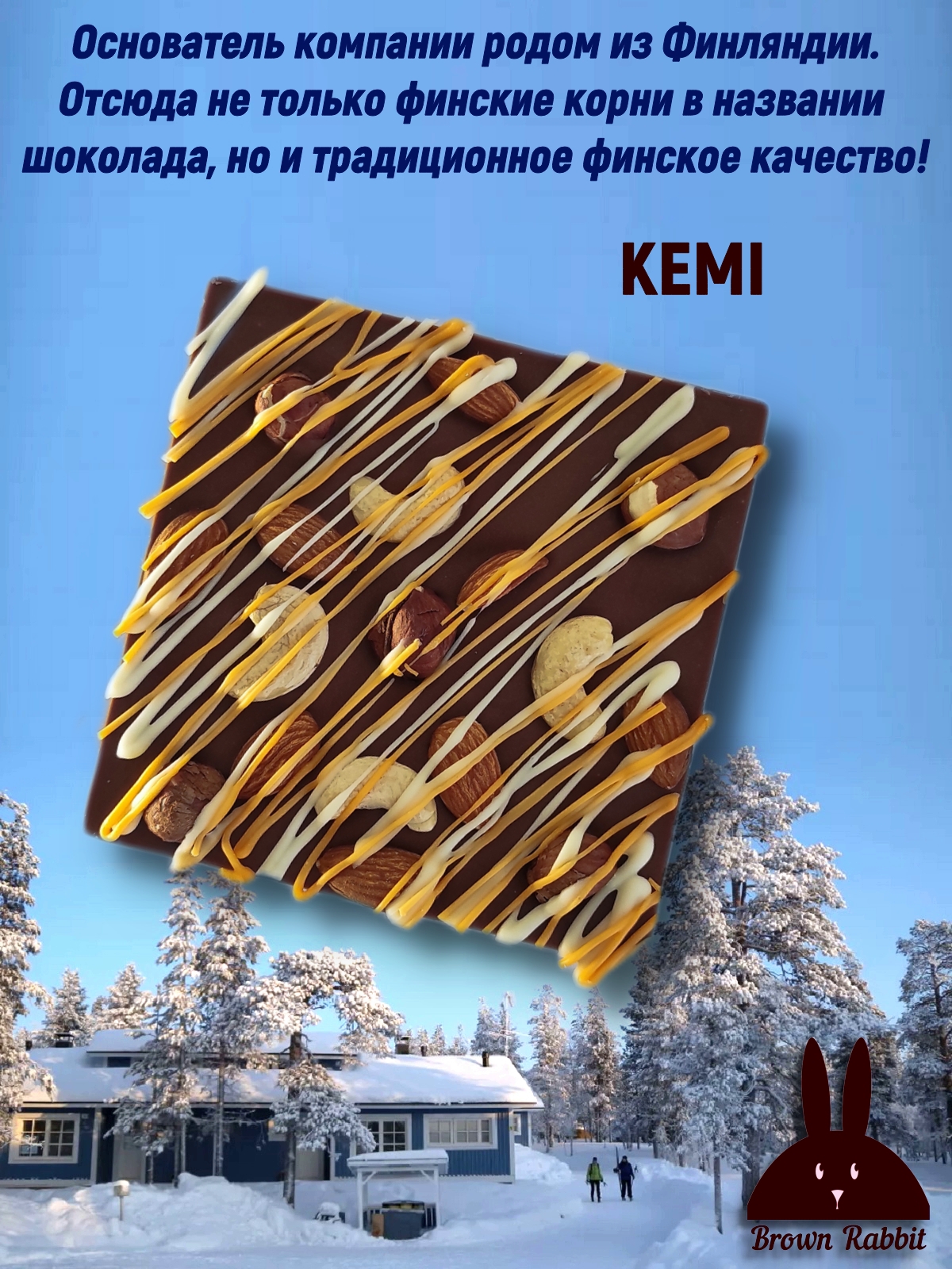 Возможно, вы уже пробовали шоколад с кешью, шоколад с фундуком или шоколад с миндалем. С шоколадом Кеми мы предлагаем вам насладиться элегантным сочетанием всех этих вкусов, дополненным белым и апельсиновым шоколадом! Искренне надеемся, что наш шоколад понравится вам или доставит радость тому, кому вы преподнесете его в подарок - мы очень старались!