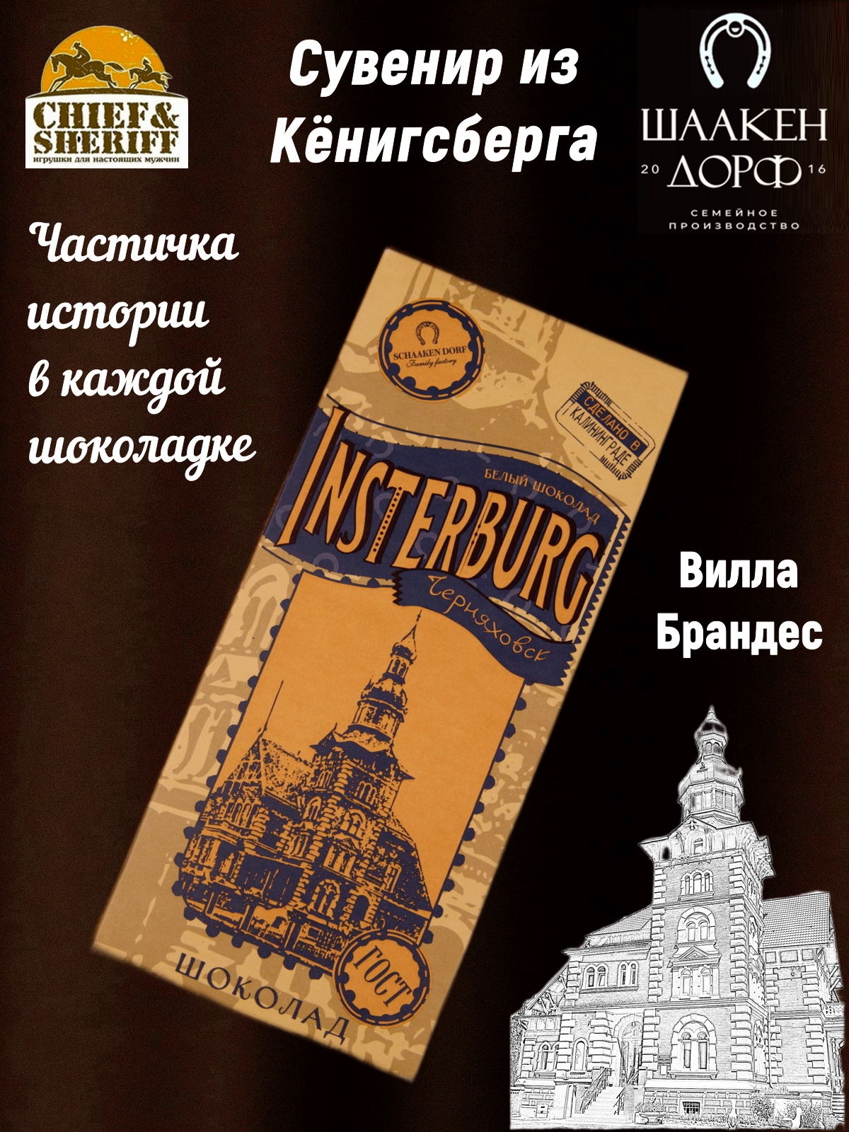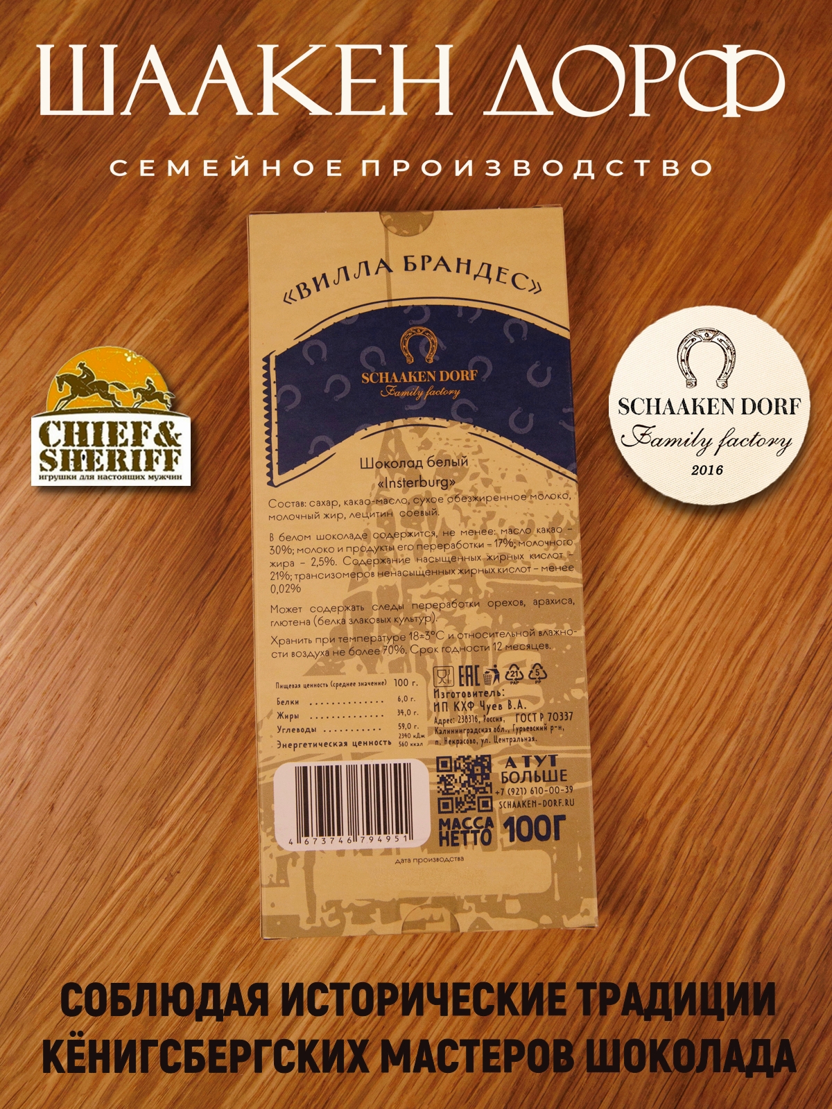 Шаакен Дорф - семейное производство сыра, марципана, шоколада, конфет и зефира. Производство компании Шаакен Дорф находится в Калининграде, в здании, которое когда-то было конюшней при замке Шаакен - рыцарей еще тевтонского ордена. Сейчас на первом этаже находится производство сыра. На втором этаже располагается небольшое кондитерское производство. Здесь вручную варится зефир, делаются карамелизированные апельсины в темном шоколаде, сублимированные ягоды, а также создается абсолютно разный и такой всеми полюбившийся калининградский марципан. В 2024 году, компания Шаакен Дорф стала победителем в номинациях «Лучшее туристическое направление года в номинации агротуризм», «Лучшее крестьянско-фермерское хозяйство», «Лучшее хозяйство в отрасли переработки молока», «Лучший объект туристического показа» и многих других!