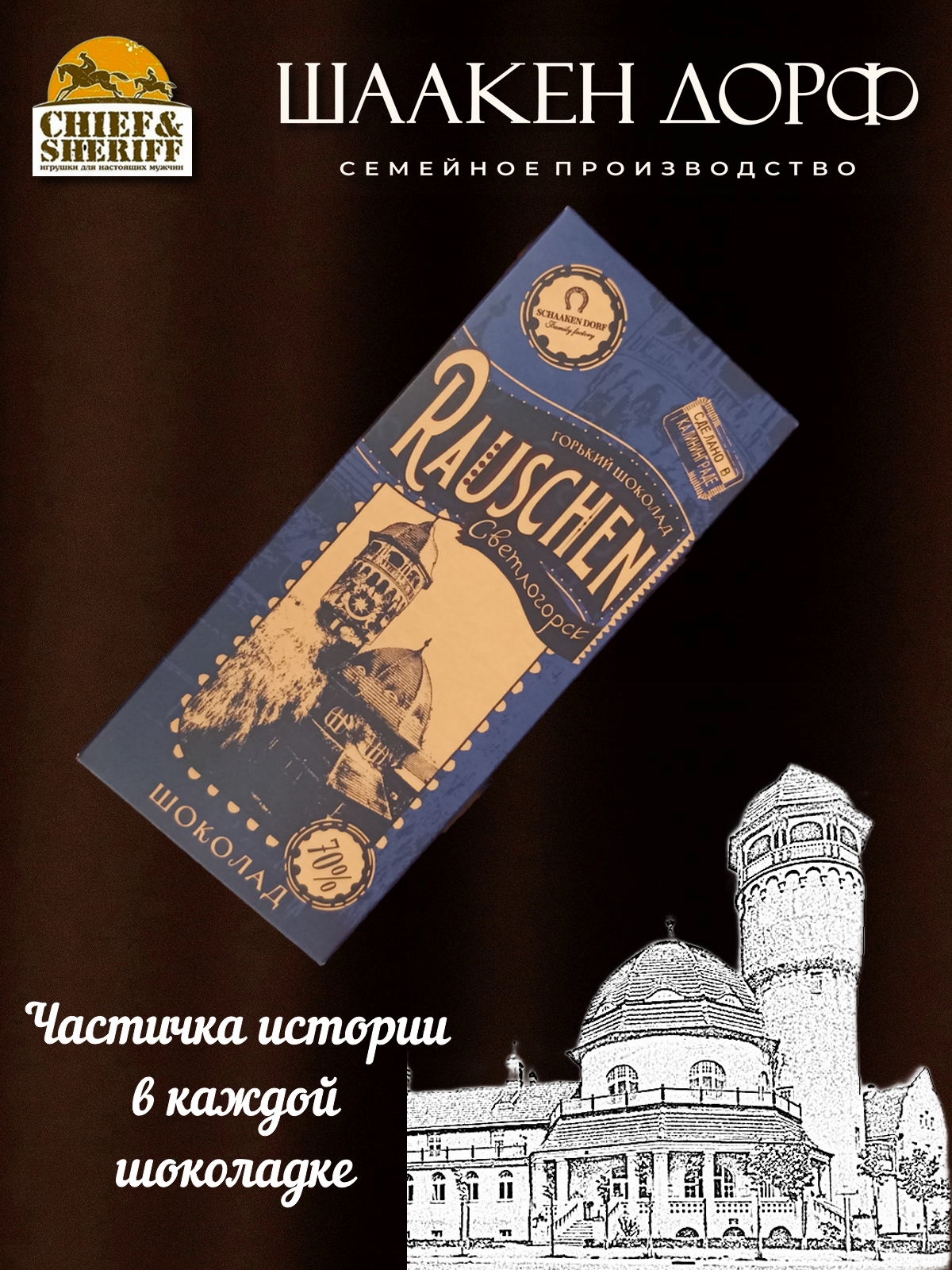 Погрузитесь в мир изысканных вкусов с горьким шоколадом от SCHAAKEN DORF, представленным в роскошной упаковке из серии "Города". На упаковке этого шоколада - город Раушен и "Водонапорная башня". Этот шоколад не только порадует вас своим насыщенным вкусом, ведь содержание какао там - 70%, но и станет отличным подарком для ваших близких. Каждая плитка весит 100 граммов, что делает ее идеальной для совместного наслаждения или индивидуального угощения.